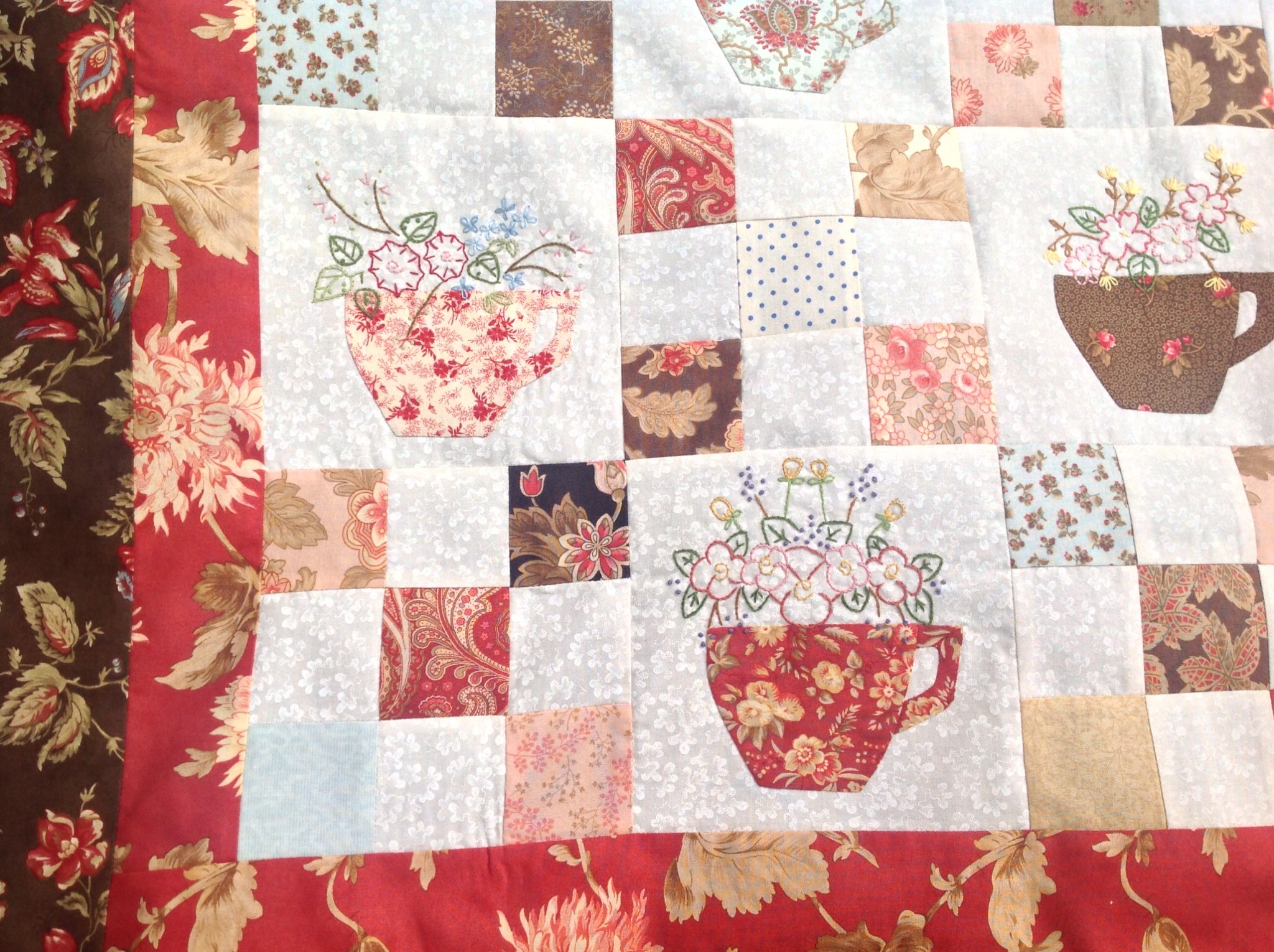 I designed this quilt myself. I hand appliquéd the tea cups and hand embroidered the flowers. I can’t remember if I used the embroidery designs from a CrabApple Hill or Black Cat Creations pattern. I believe I adapted them a bit to fit in a tea cup.
