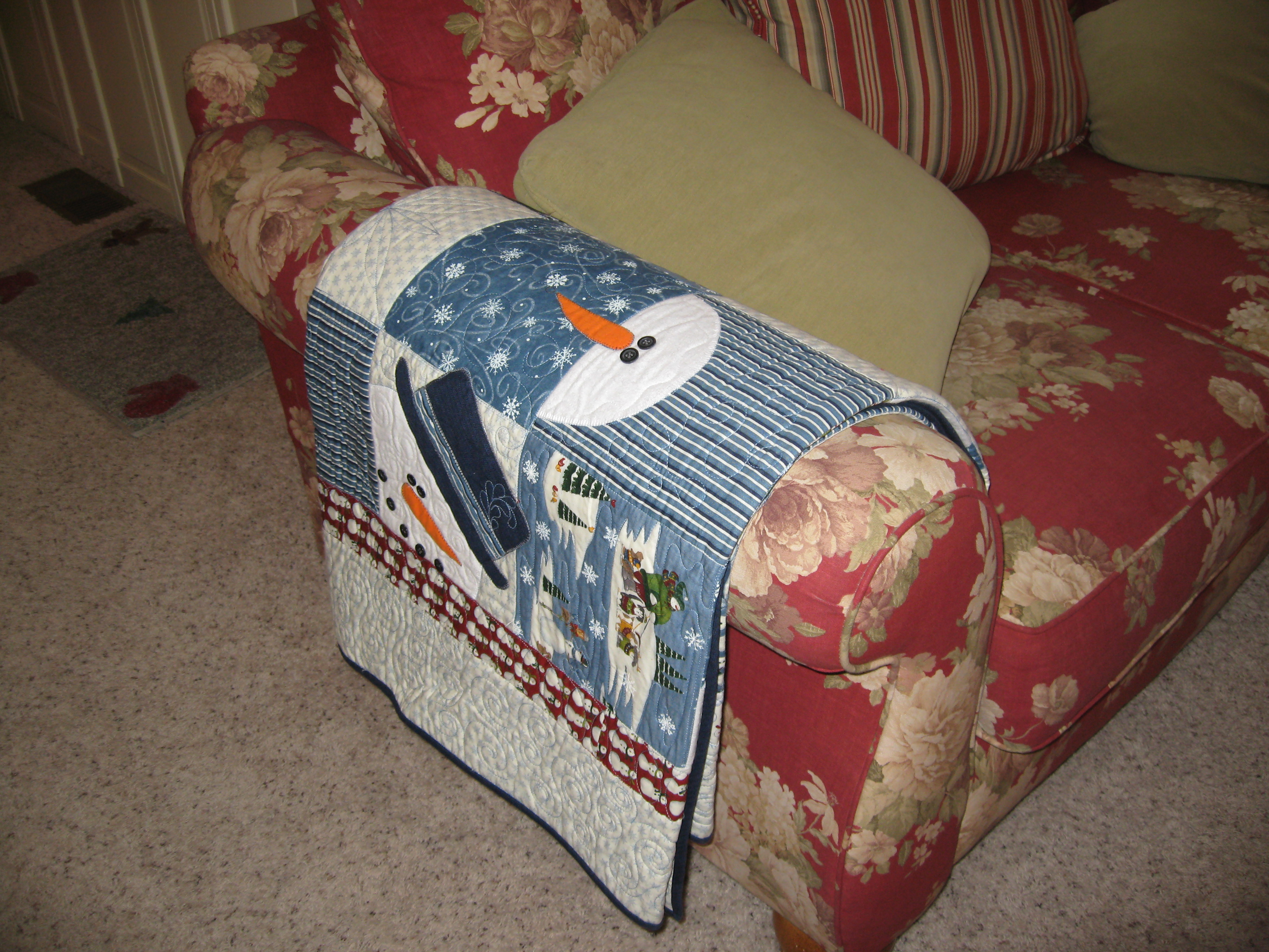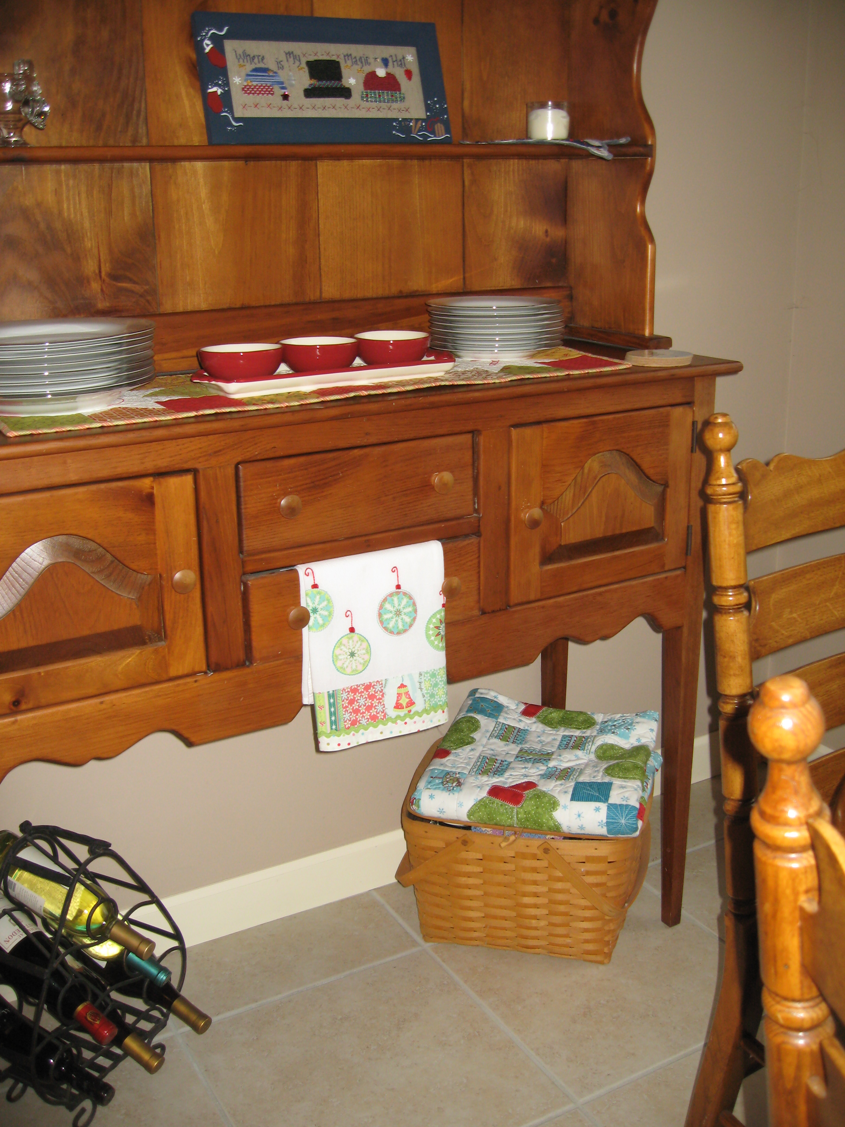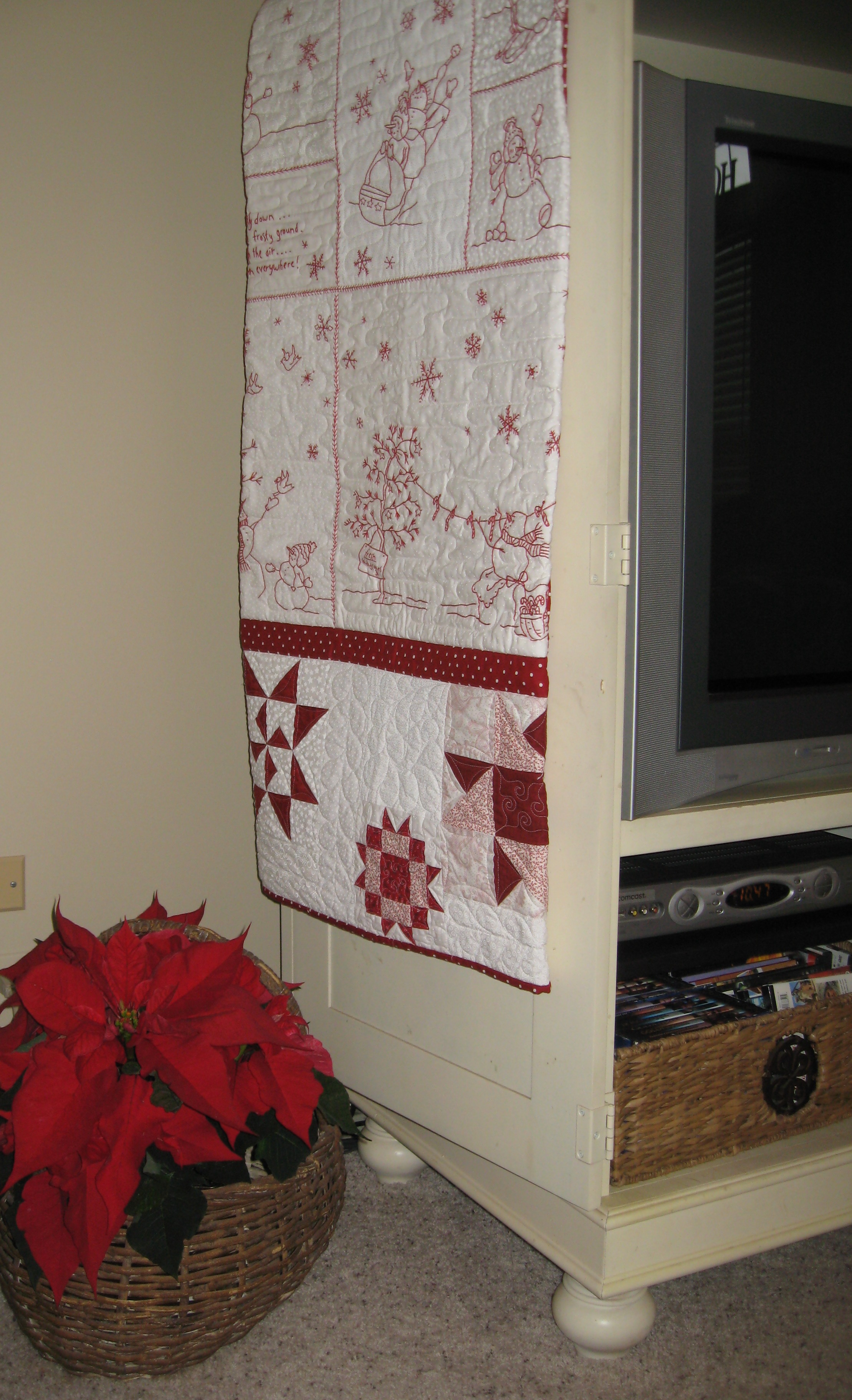 I make about 2 or 3 Christmas quilts a year. I just know my quilter has to be sick of seeing them. I have 2 waiting to be quilted, one at the quilter, one almost completed, and one that’s in planning. And that doesn’t include the table toppers or other Christmas items I also make. I can’t help it though. I love Christmas fabric! So, I thought I’d share some of my quilts and how I display them through Christmas.