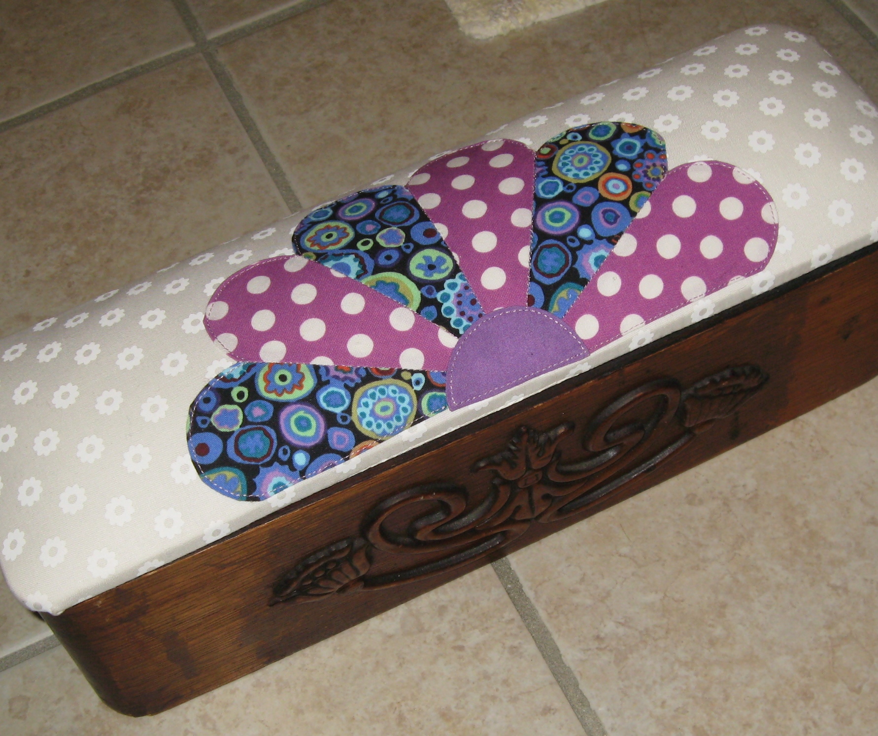 I’ve got a couple more boxes. I’m working on another one with the hand quilted Grandmother’s Flower Garden & a GFG block that’s appliqued on yellow plaid. That one is turning out cute, cute!