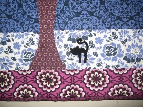 I wish the camera picked up all the beading she added to her quilt. It’s along the grass line, the kitty’s eyes, and in the leaves.