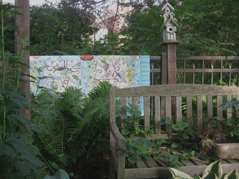 The quilts looked beautiful hanging in the sunlight surrounded by flowers and trees. This little garden would have made a perfect place for a small quilt display. MCC was featuring the quilt garden block on the tour, but to be honest, we still can’t figure out which block it’s supposed to be.