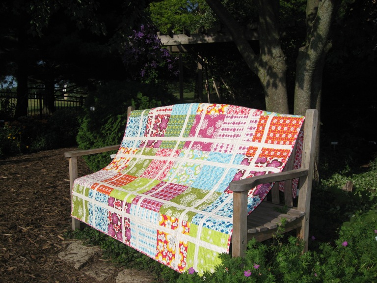 Everywhere we looked we saw perfect areas to drape a quilt, so we asked permission to come back and take pics. We had just finished up with one of our shop samples from the Pick A Bunch line. What better quilt to display in a flower garden than a sweet little quilt with colorful daisies on it.