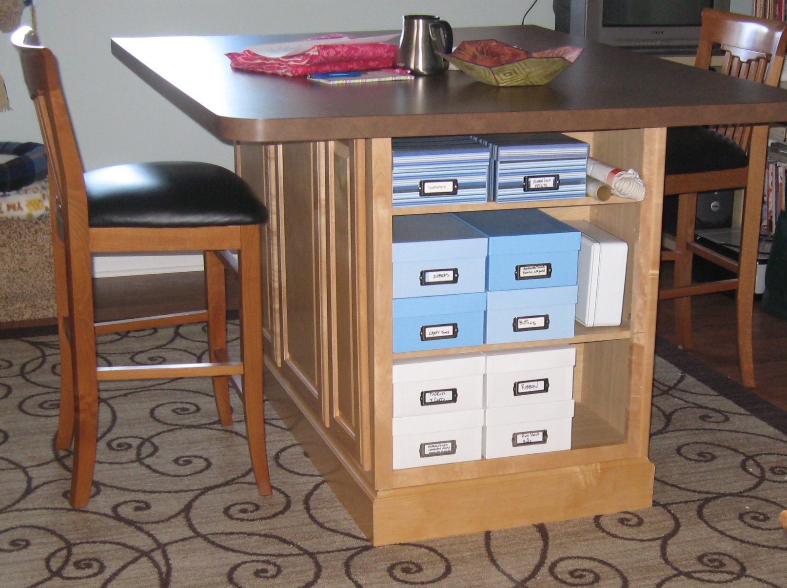 This is her new work table. A huge table top with lots of cabinet storage underneath.