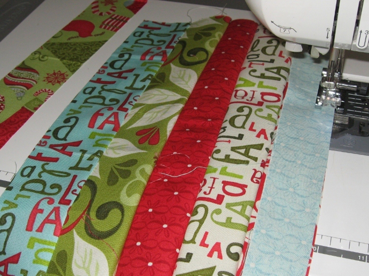 Cut your fabrics into strips and sew them with right sides together as shown.