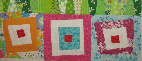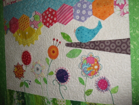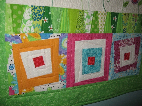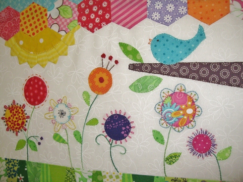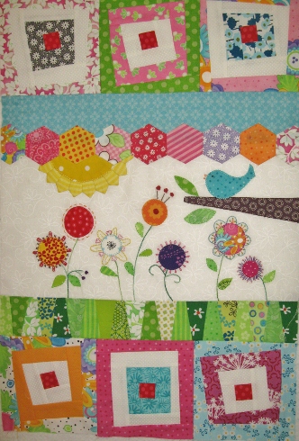I really enjoyed doing this. This pattern has many techniques in it that kept me interested. Embroidery of course, applique, both hand and machine, making the hexagons, and using the easy dresden to make all the wedges for the grass and the sun. The one thing I had never done was make the wonky log cabins. I saved them for last and as you can tell by this middle blue and pink one, my first attempt was a little not so wonky.