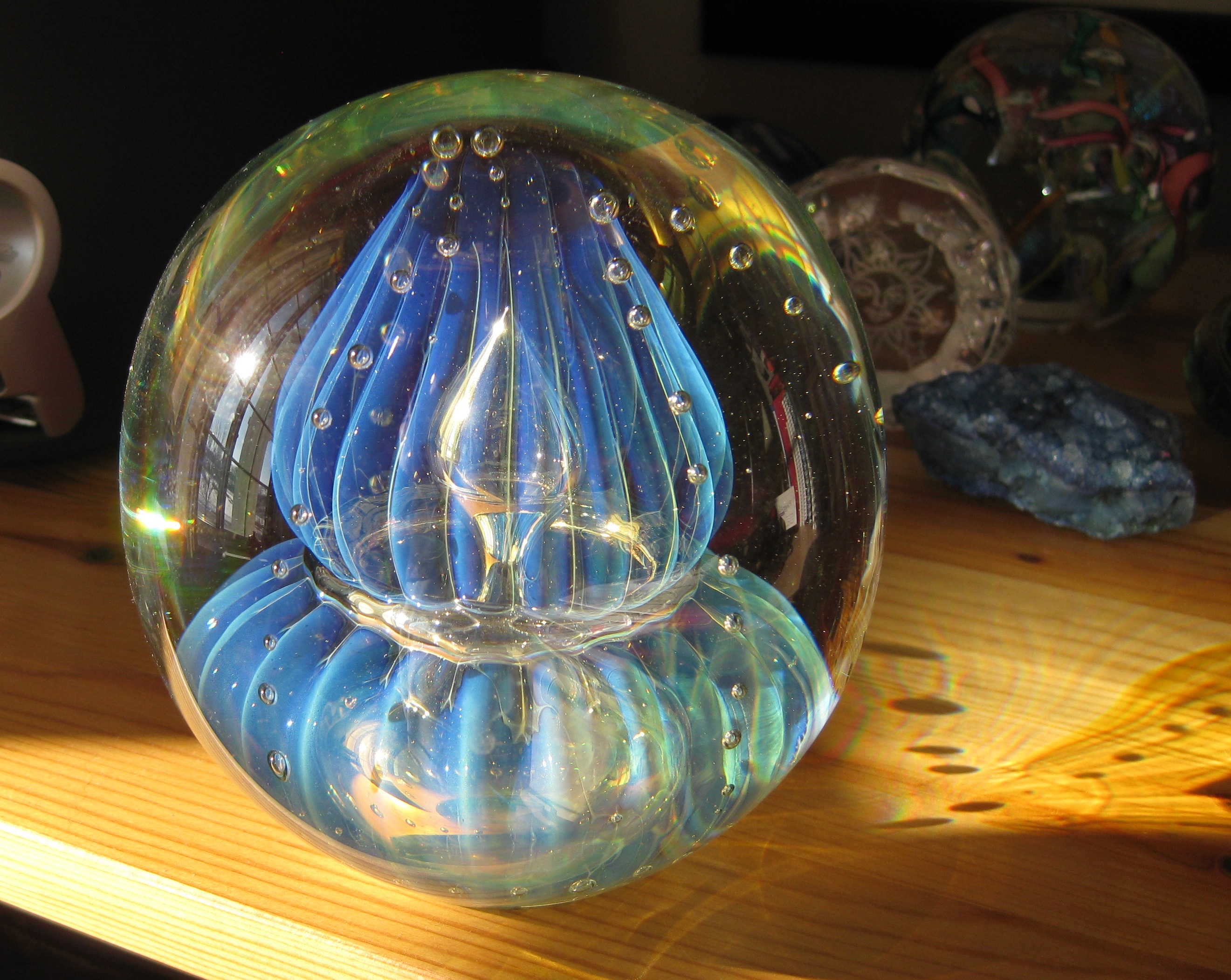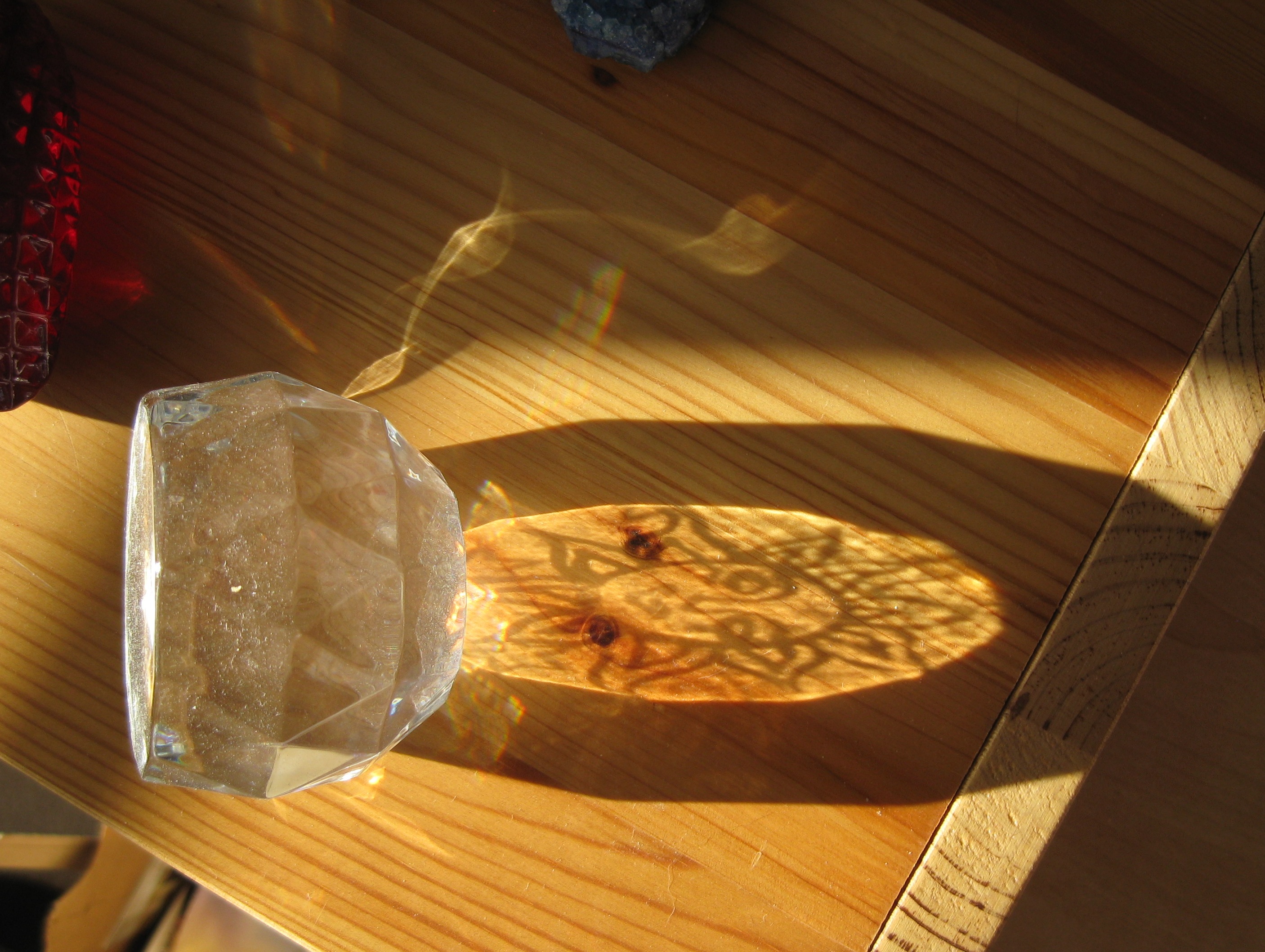 I love when sunlight flows thru glass and creates intricate designs. The sun is just about at its lowest angle to the horizon so my entire house was filled with light art.  I have a small collection of paperweights see how they sparkle…this one reminds me of an upside down jelly fish!