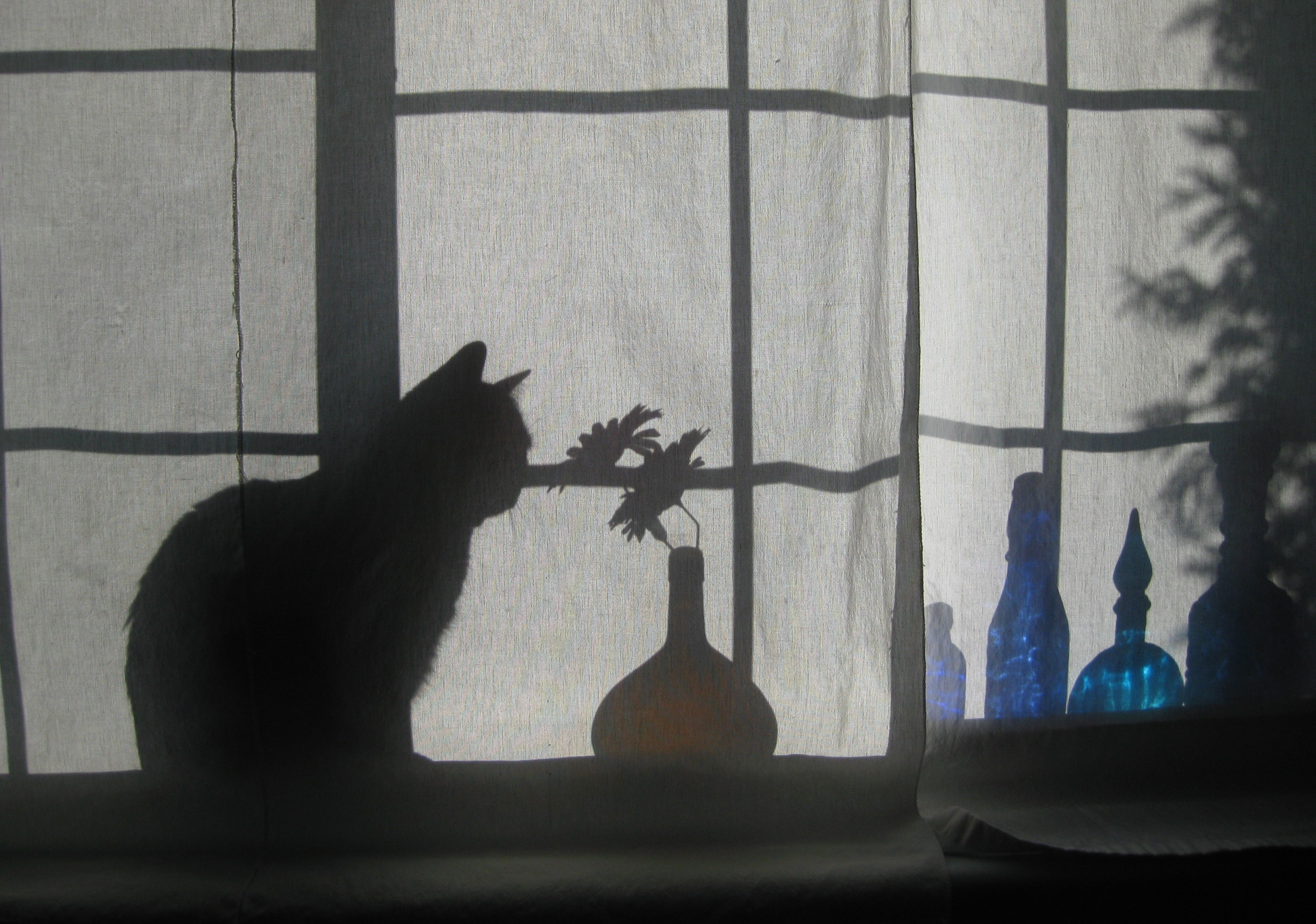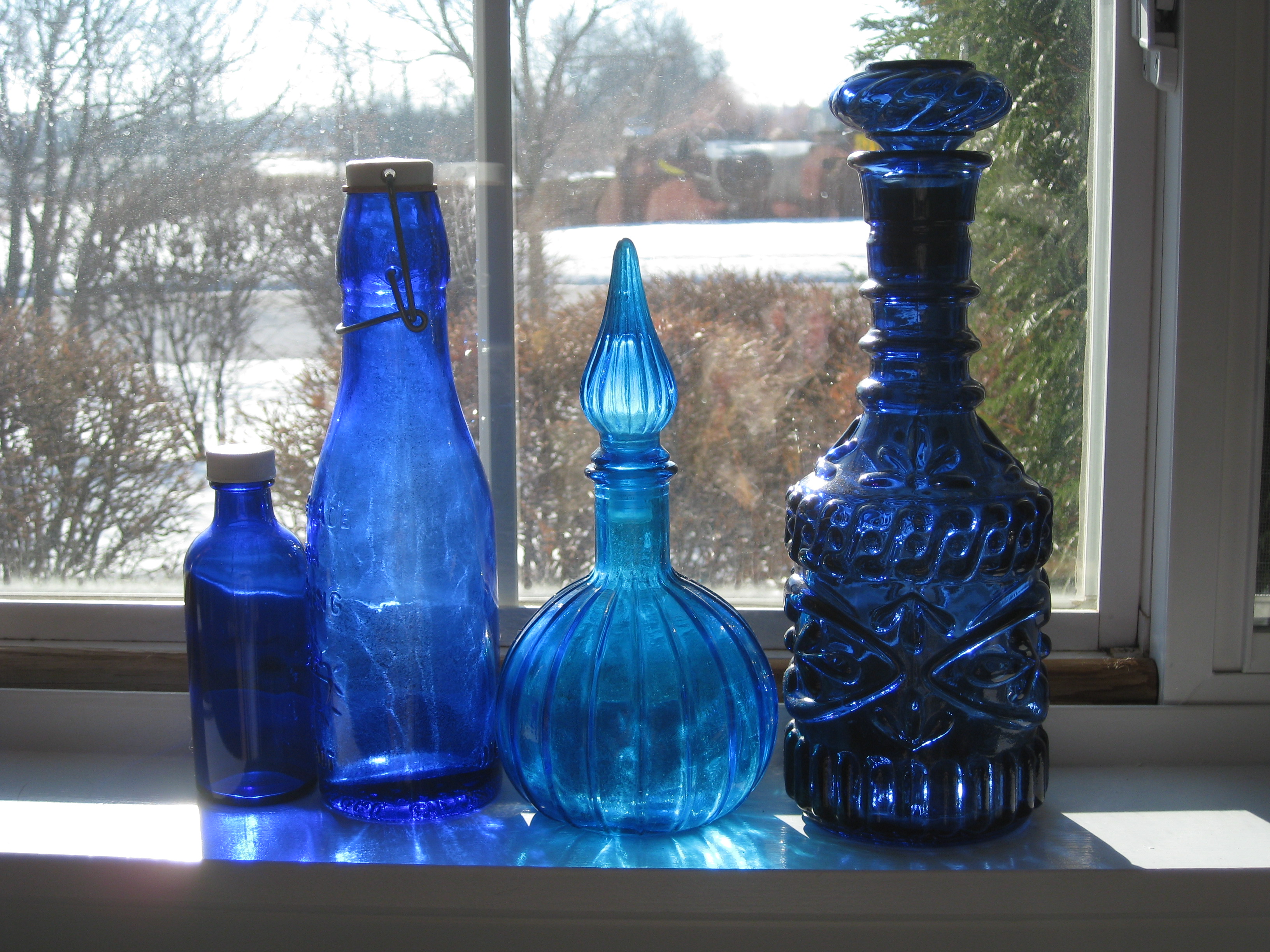 After playing with the paperweights in my loft I proceeded to my quilt studio in my basement where I have an ensemble of blue bottles…