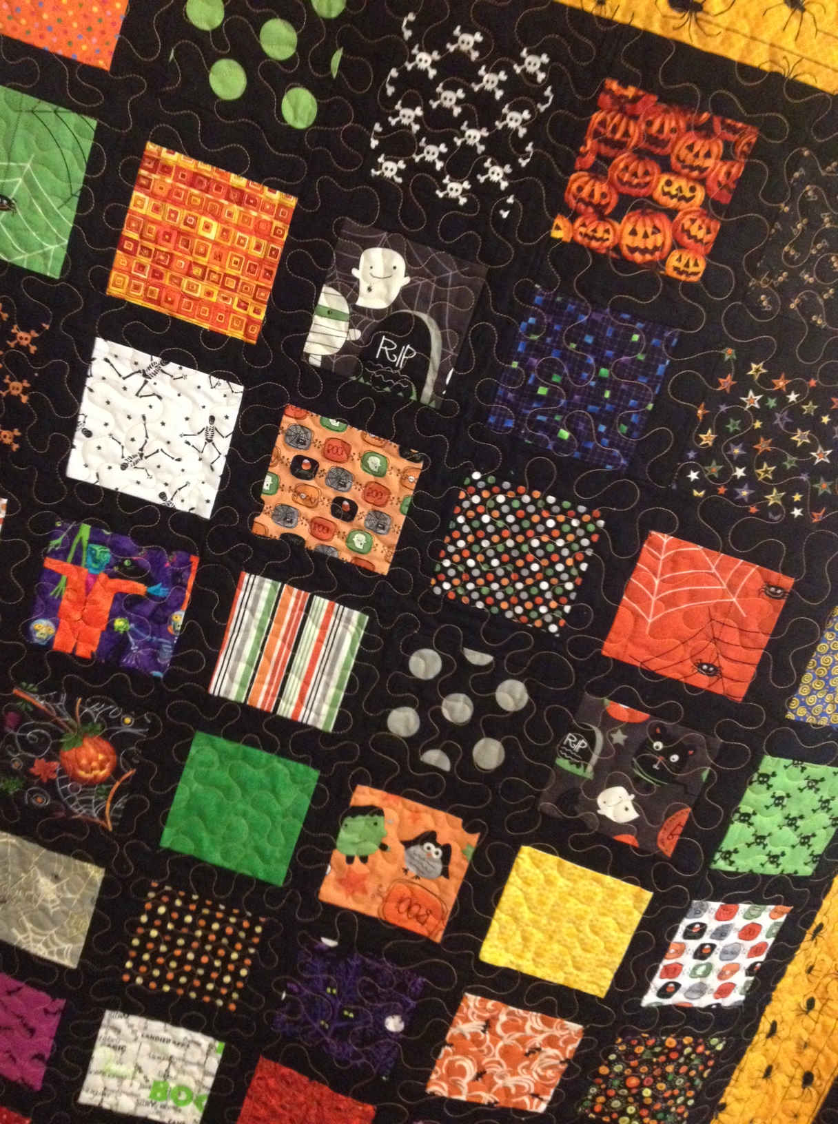 Kelly worked on the binding for a Halloween quilt made from charm square scraps.