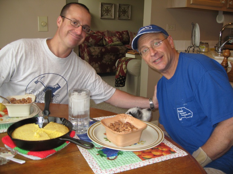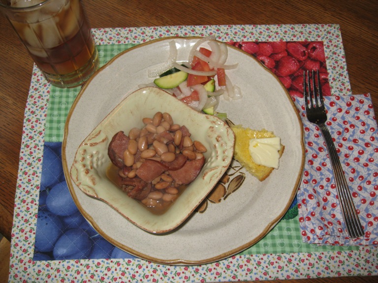 I made a nice lunch for the guys when they were painting the studio. Paula’s recipe for Pinto Beans in the slow cooker, cornbread, and a salad made with raw Vidalia onion, zucchini, and Roma tomatoes, sprinkled with salt, pepper and red wine vinegar. I love this summer salad. I make these pinto beans all the time. Although, when I was back home we had them jalapeno cornbread instead…yummy!