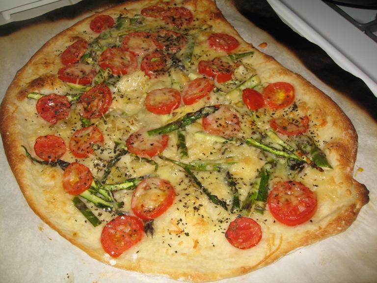 We are blessed in Chicago with the best pizza. But when I prefer to make my own, the premade dough can be bought at our local Italian grocer. All I have to do is bring it home and roll it out. It’s so good and if you split the dough, you can freeze the other portion for a different lunch. Susan came over to help. We used Martha Stewart’s Veggie Pizza recipe. We topped it with whatever veggie & cheese I had at the time… artichokes, asparagus, tomatoes, Romano & Gruyere cheeses.