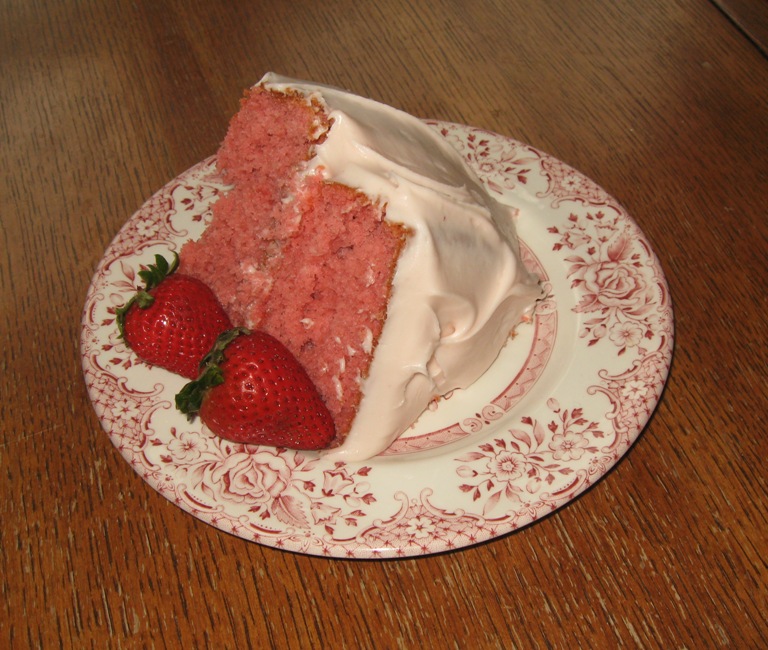 It turned out pretty, didn’t it? At least this piece did. I had a cake malfunction when I removed the wax paper from the bottom after icing it. The paper pulled the bottom of the cake off:(