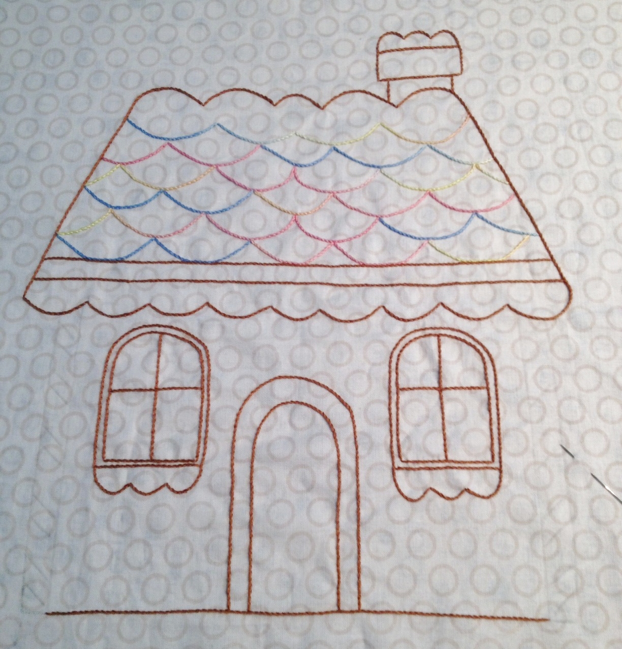 So that’s what I worked on during our sew-in. I chose to do an embroidered gingerbread house from a pattern I purchased from an Etsy shop called BigBgd. Very cute stuff! I enlarged one of the designs and embroidered the outer lines so the girls could have fun with the landscape and “candy decor”.