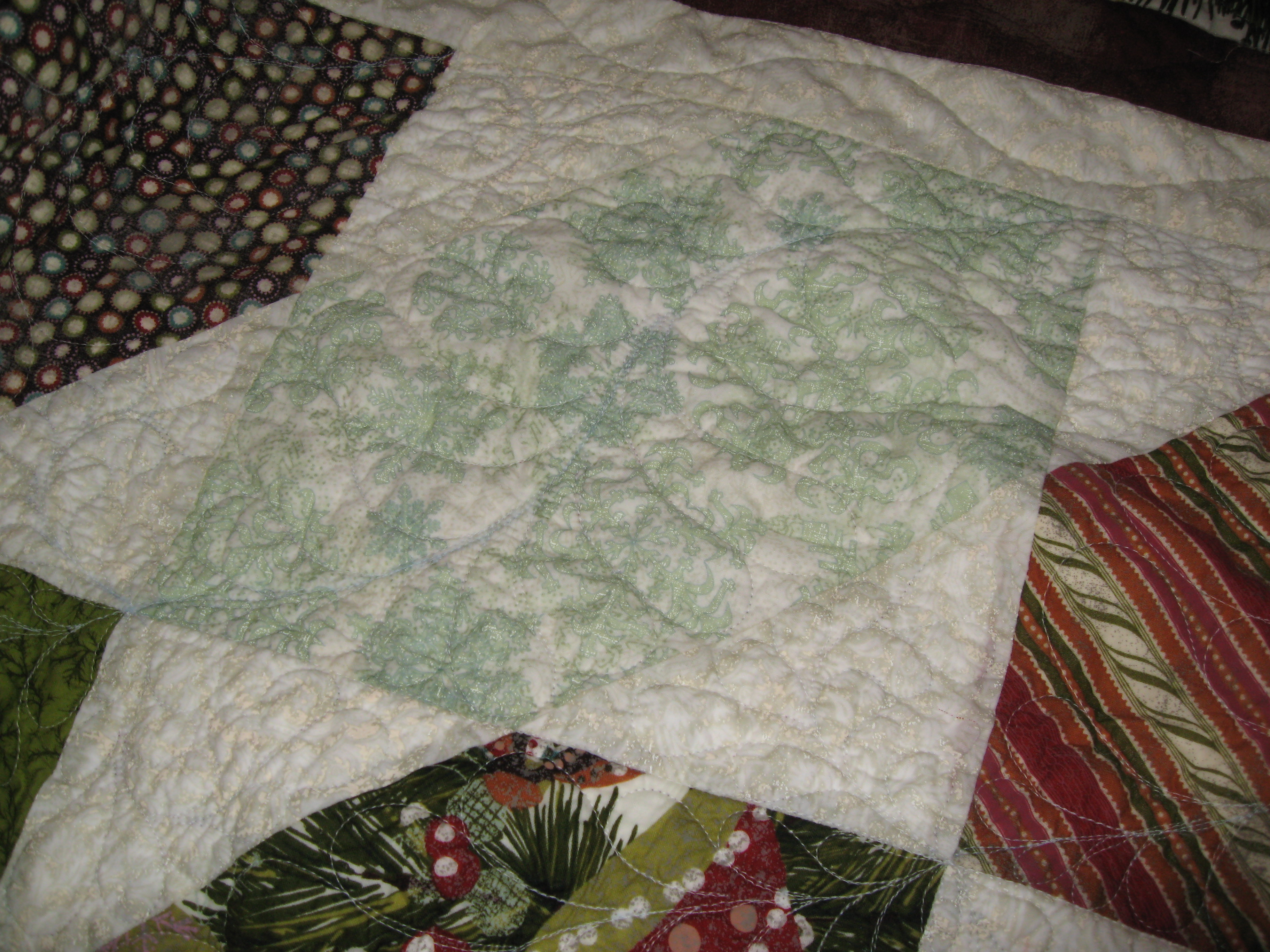 Just got it back from the quilter and she used a blue marking pen on it. Need I say more? I really hate those things. They are very unpredictable! For starters, I’m not the girl who washes a quilt when I get it done. I like crisp and fresh. So that’s a little disappointing, but what’s a bigger disappointment is that I’m going to end up trashing something I worked hard on, cost a lot of money, cause let’s face it people fabric is not cheap, and it’s from my favorite lines of all time…ugh. I’m sooo frustrated. These are the pics of the quilt after it’s been washed a zillion times using a zillion methods. You may need to enlarge them for the blue to show up.