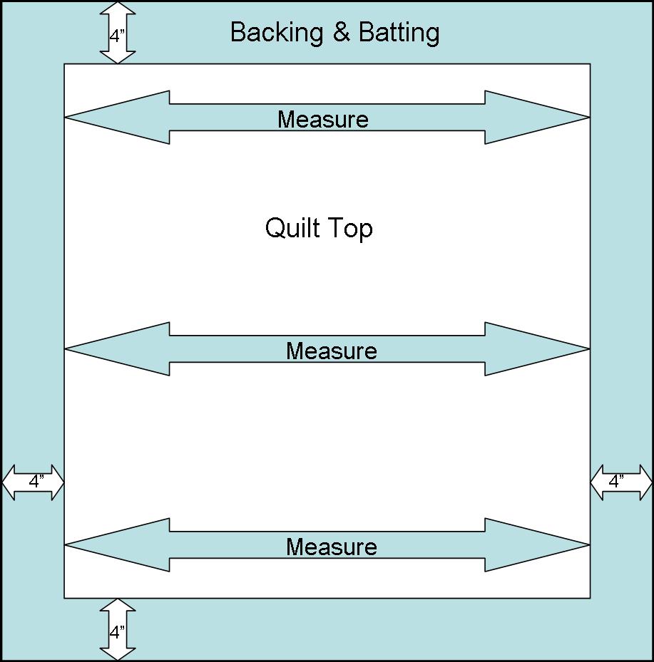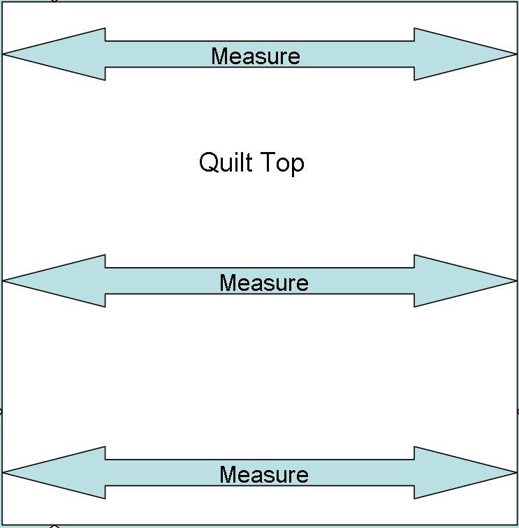 - For flat borders, measure your quilt center in three places as shown in the diagram below…1) where the border will be sewn on 2) down the center and 3) the opposite side of the quilt then take the average -this will give you a consistent accurate measurement for the opposing borders. Pin borders on, stitch and press. When stitching your borders on, consider using a dual-feed/walking foot on your sewing machine to help pull both the quilt center and border fabric at the same time avoiding either from stretching more than the other.