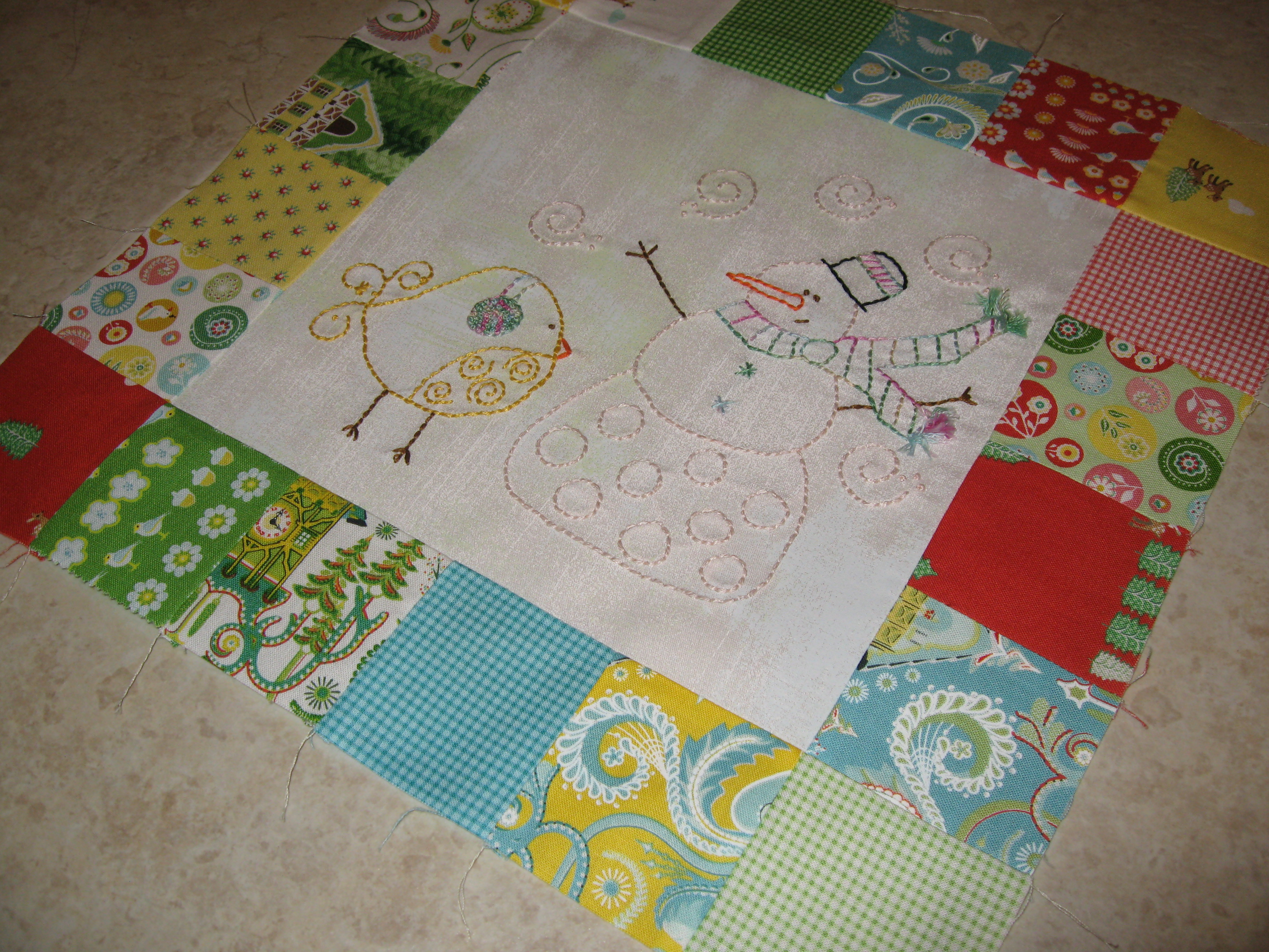 This time I used Moda’s Grunge in white. I like this version much better. I do wish I’d done the snowman in a darker pink and when all is said and done, I’m sure this block will be on its 3rd version. I’m just that way. I want it perfect!