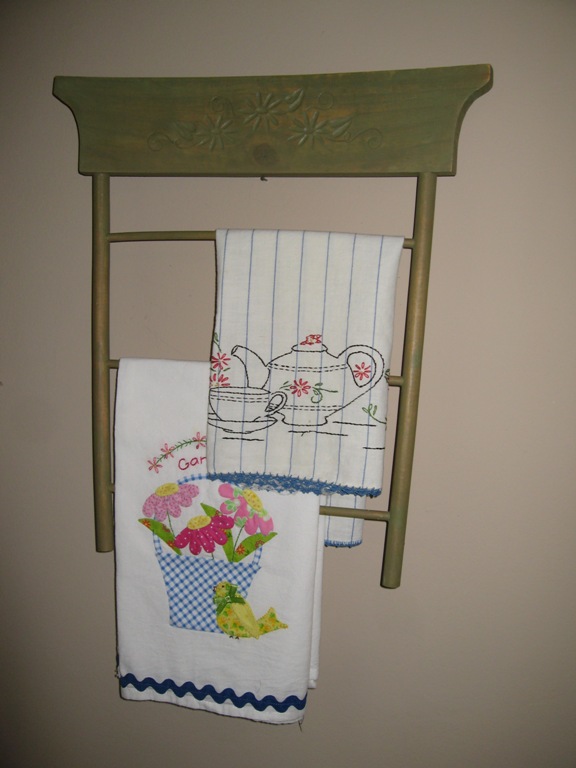 I like all the props, the dish towels are really cute. Love the window frame would look great with embroidered or appliqued pictures great idea makes me want to go find one.