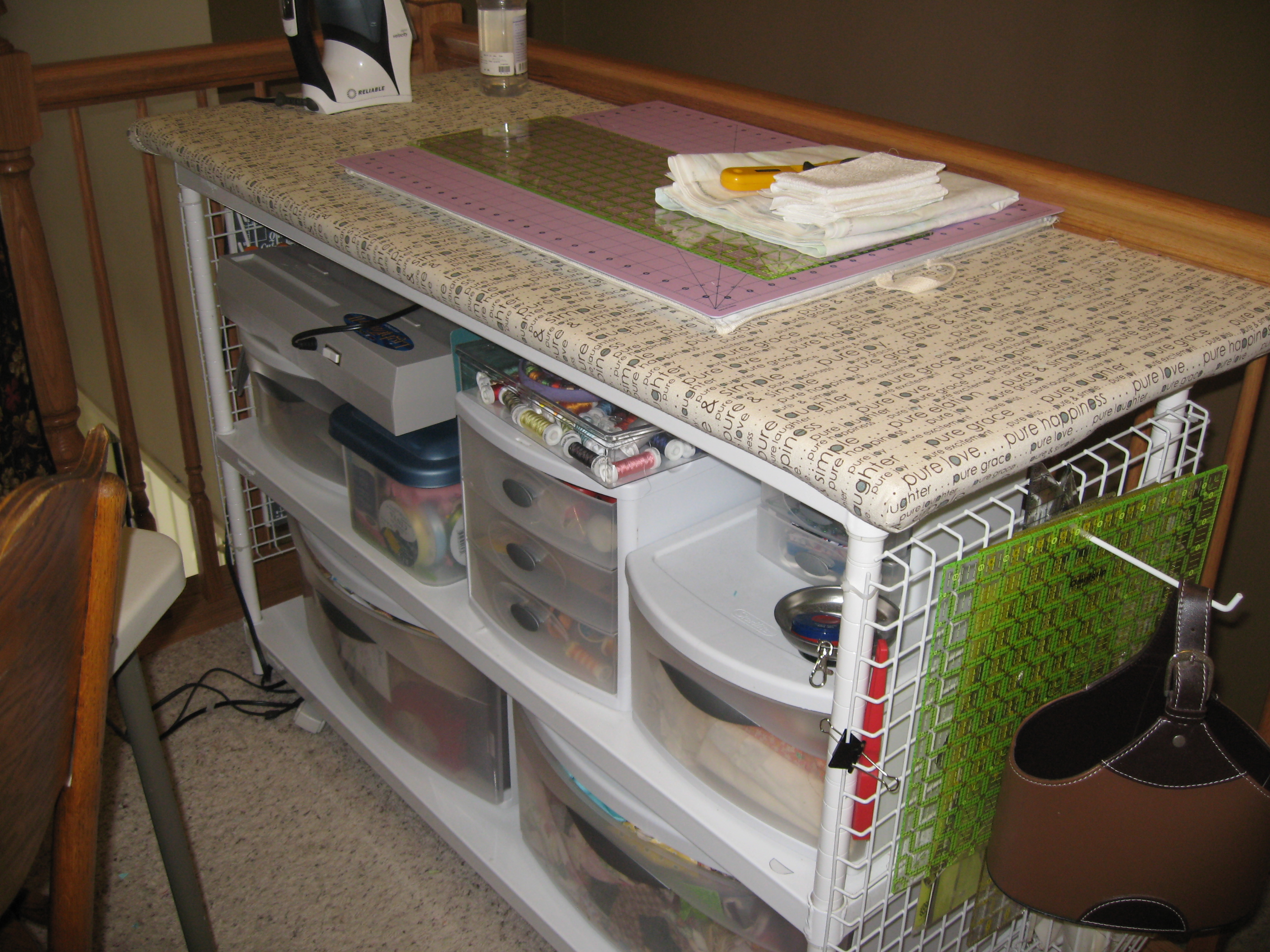 The bottom has container storage which houses a giant, annoying, unbearable to look in, overflowing, and I don’t dare open scrap bin, precuts, trims, supplies, to-do and current projects.