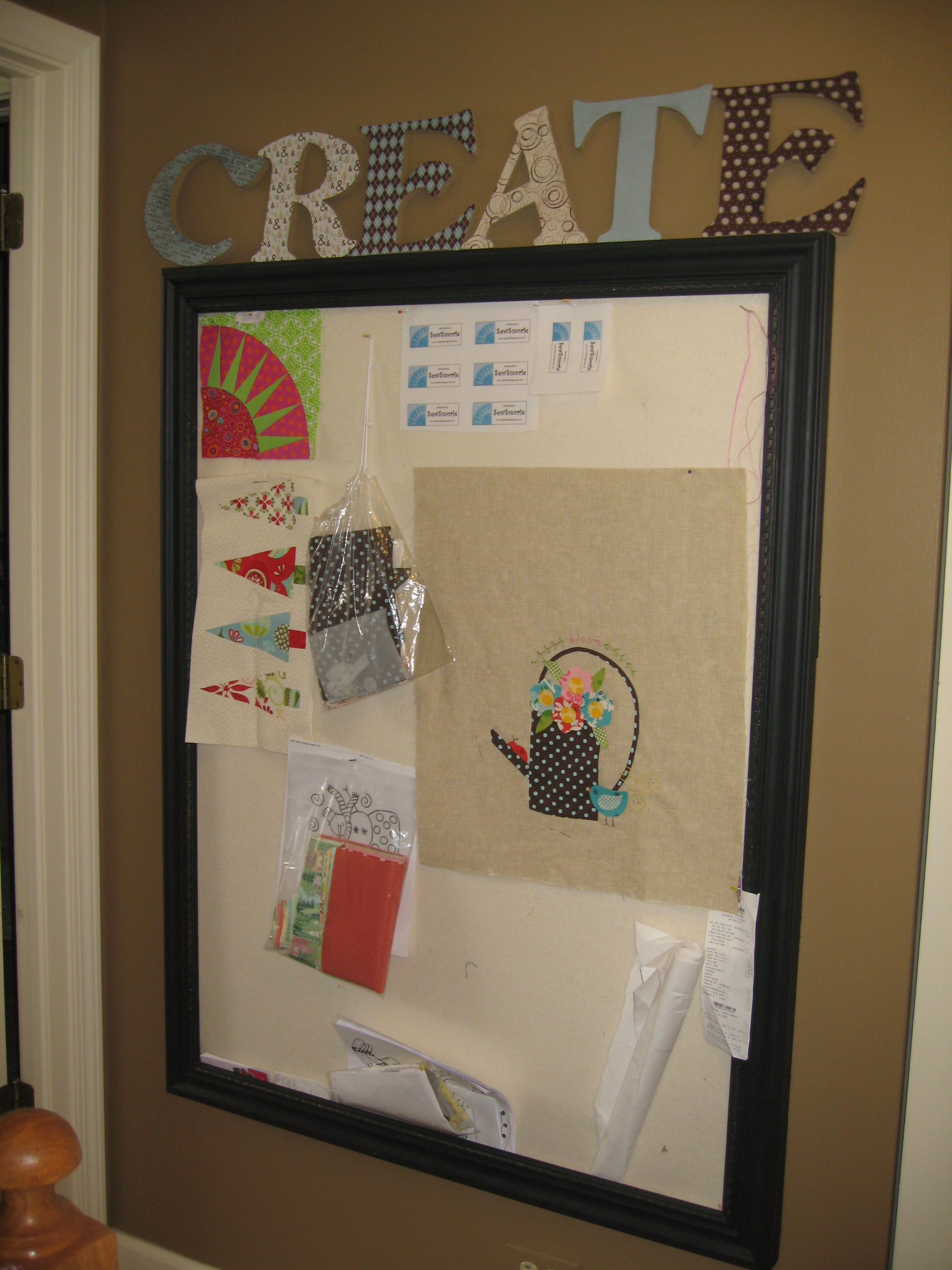 This used to be a batting covered board propped up against the wall. I would bump into it, the dogs would knock it over and it was just plain ugly. I had a neighbor frame it and we hung it on the wall. One of the best things I did for this tiny space.