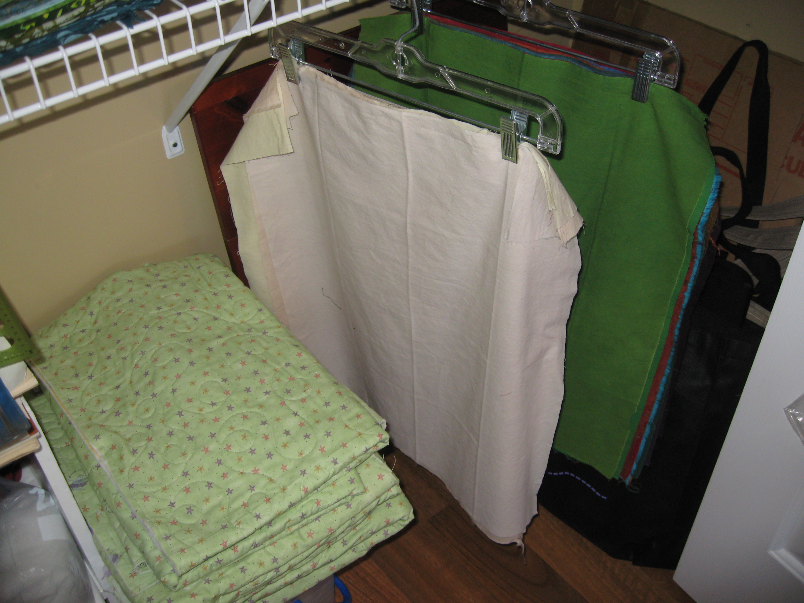 Hanging your “waiting to be quilted” projects or these hand dyed fabrics from hangers is a great idea.