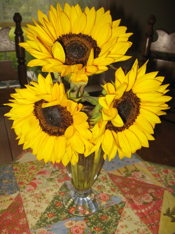 Since Paige and I have already “shown” our projects on the blog, I’ll show you what Karen V. brought me. The prettiest sunflowers I think I’ve seen. Fresh flowers always brighten the home.