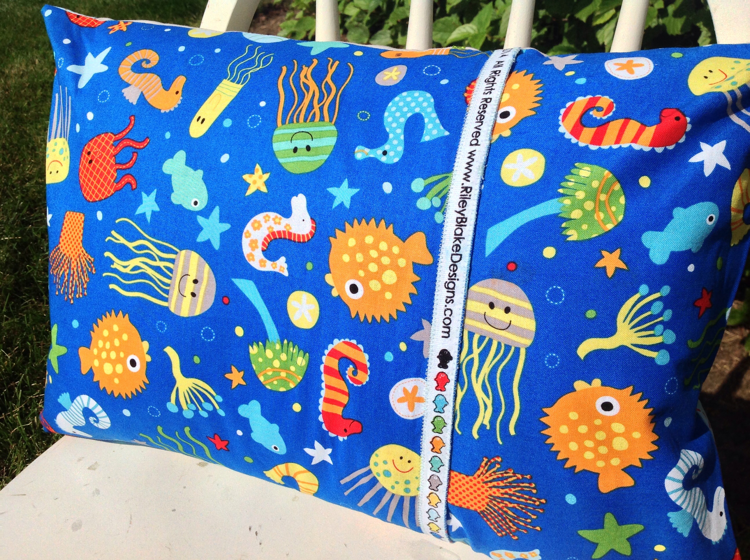 I couldn’t forget the back of the pillow. It deserves something just as special. I fussy cut the selvage since the fishes were representing the color codes. A simple zig zag to tack it down and now it’s done!