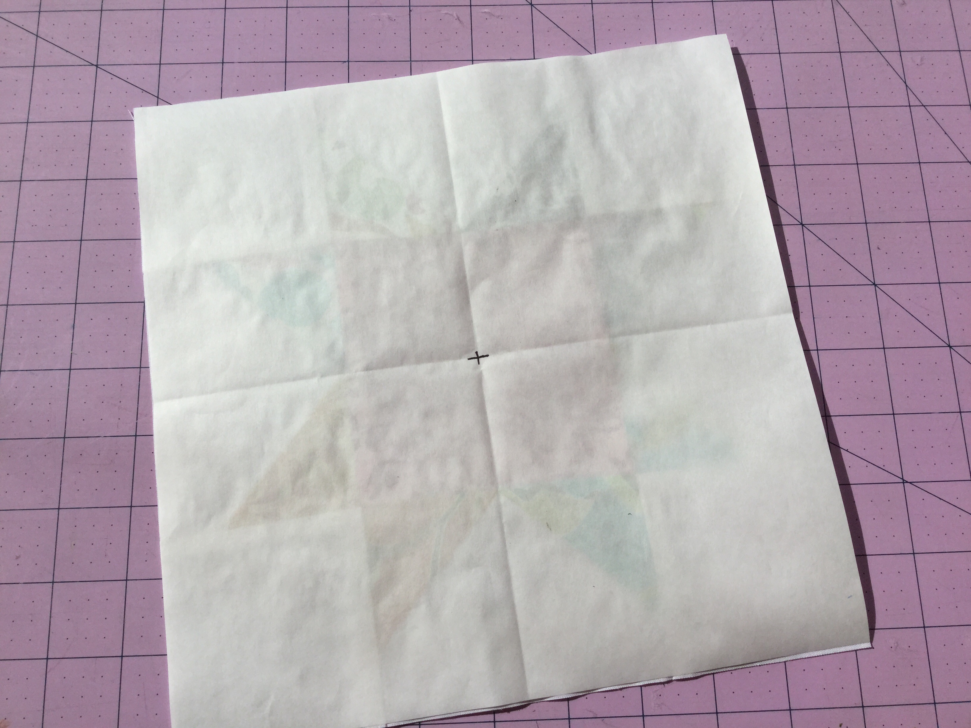 Start by cutting a 9-1/2″ square from freezer paper, fold it into fourths and mark the center with a x.
