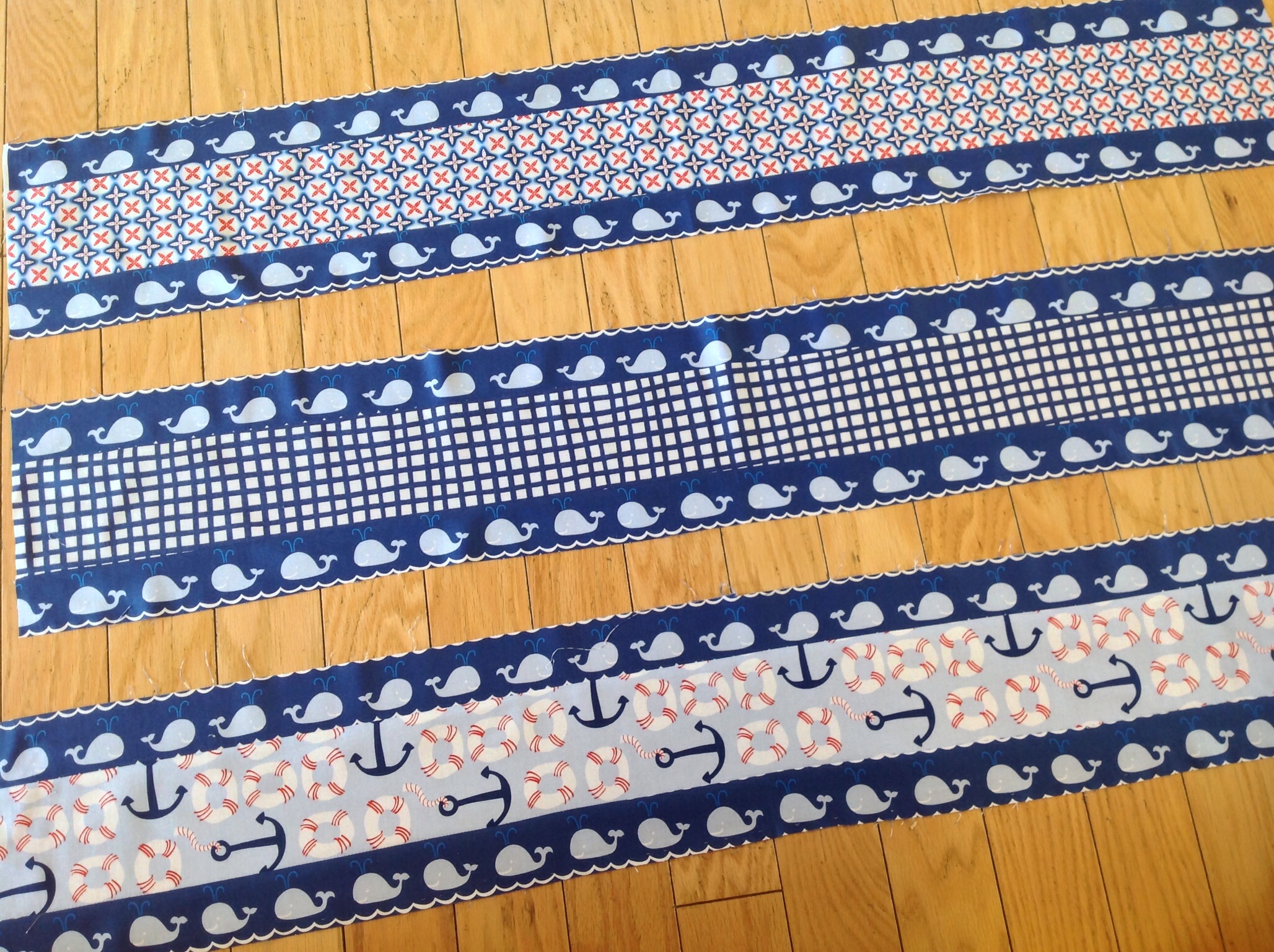 I knew I wanted to do a strip quilt with this line. It’s perfect with the big playful whales and the baby whales in a row!