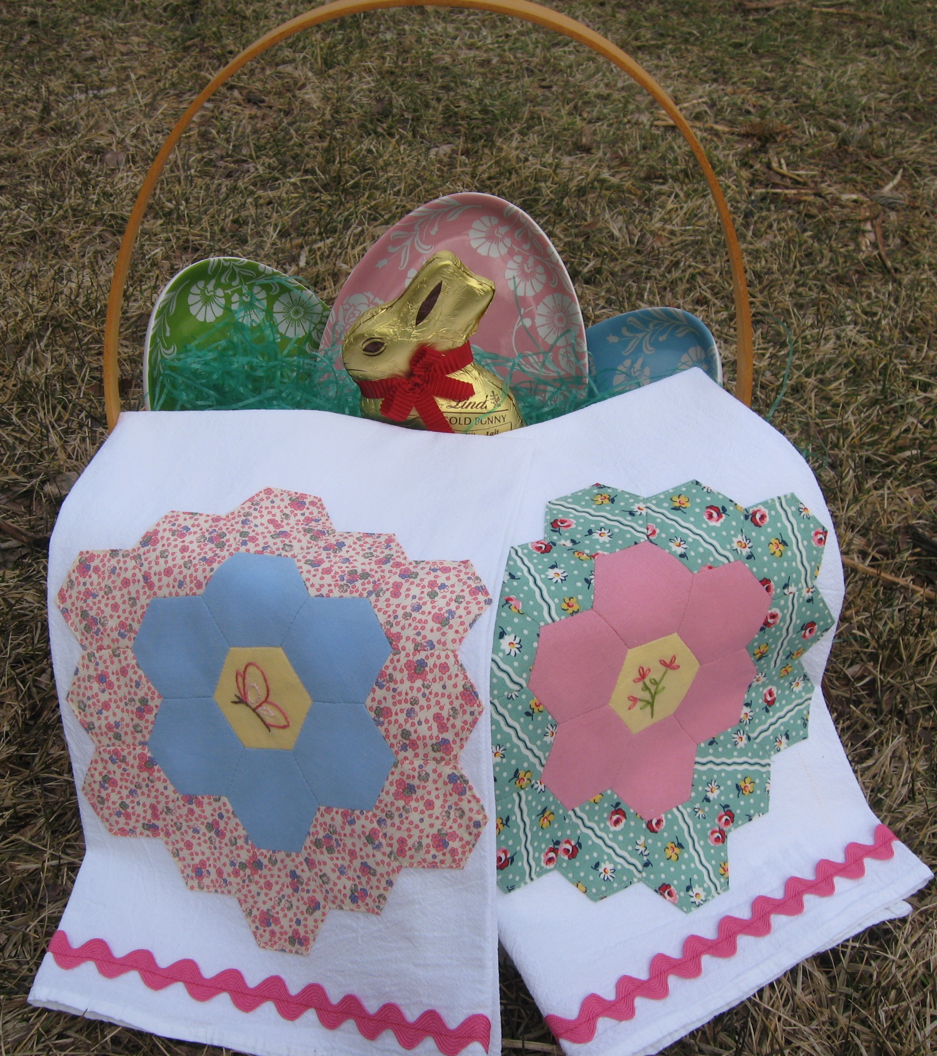 Yesterday, Jeanne, my Oklahoma Sista from my Flickr Tea Group asked us how our spring projects were going. Well, Jeanne here’s what I’ve been doing and I’d have to say they are going pretty well. I made these cute tea towels with some of my leftover Grandmother’s Flower Garden blocks.