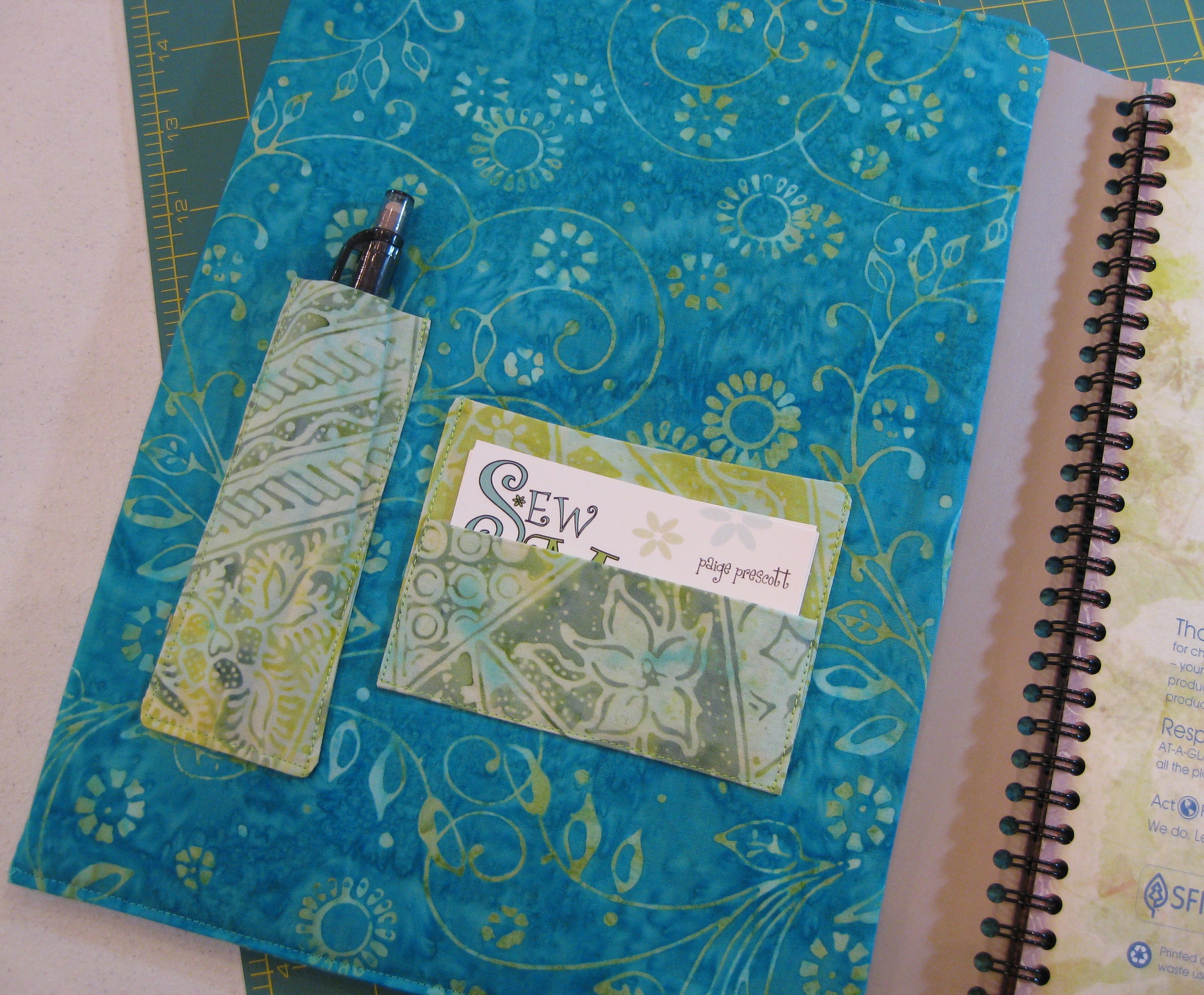 Shortly after we arrived, Patsy served dinner and we all hung out on the back porch to catch our breath and enjoy a glass of wine. We then jumped right into our projects.  I started with creating a fun cover for my date planner using the SewMod embroidery Lorrie did for me in beautiful varigated thread -look how wonderful it goes this awesome batik! I love this batik so much I couldn’t resist making a cover for my cell phone.