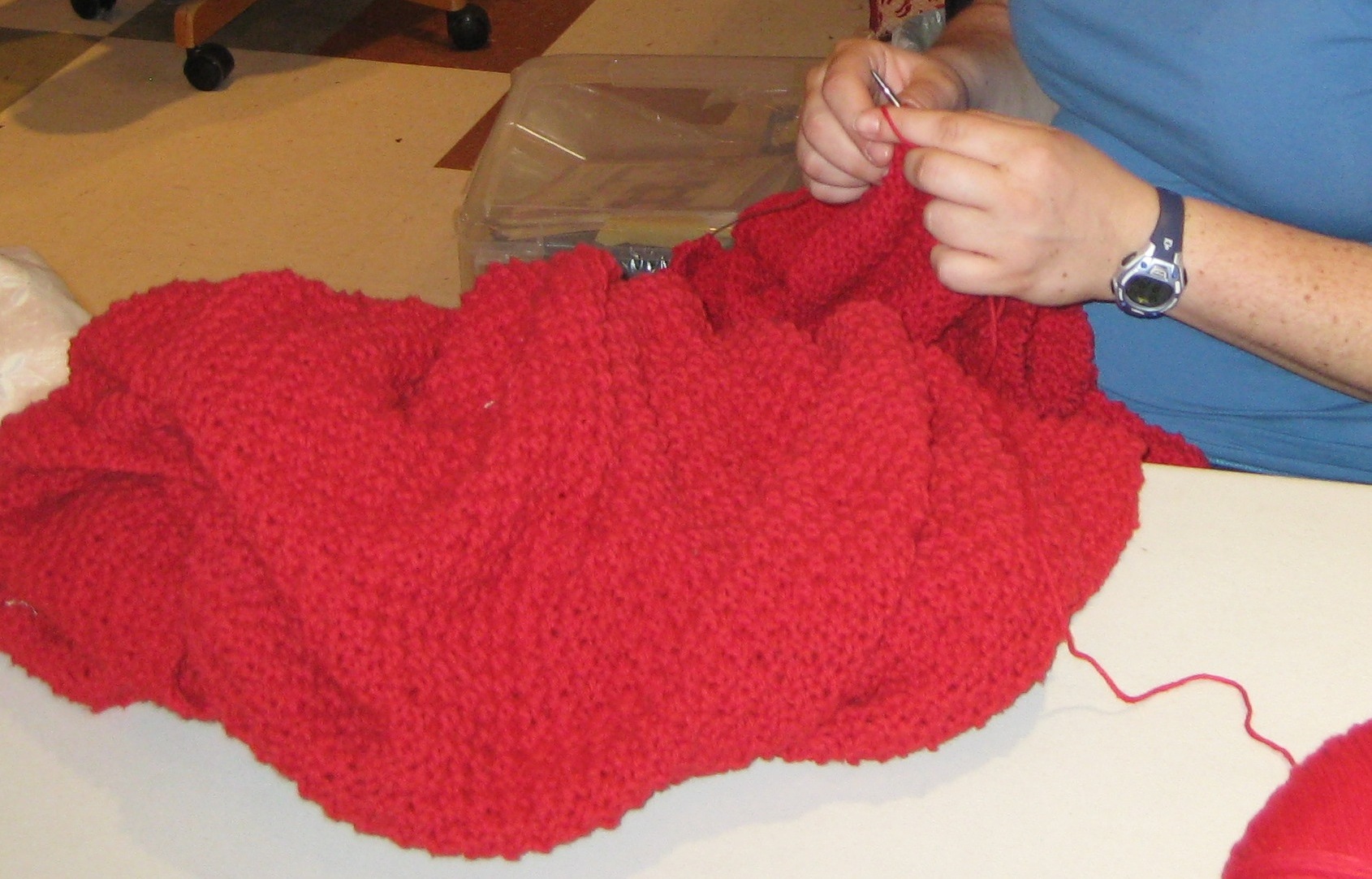 Jen cut out several aprons, I loved this one in an orange/white flower from Denyse Schmidt’s Hope Valley line. She also completed a beautiful cotton knitted blanket for her husband.