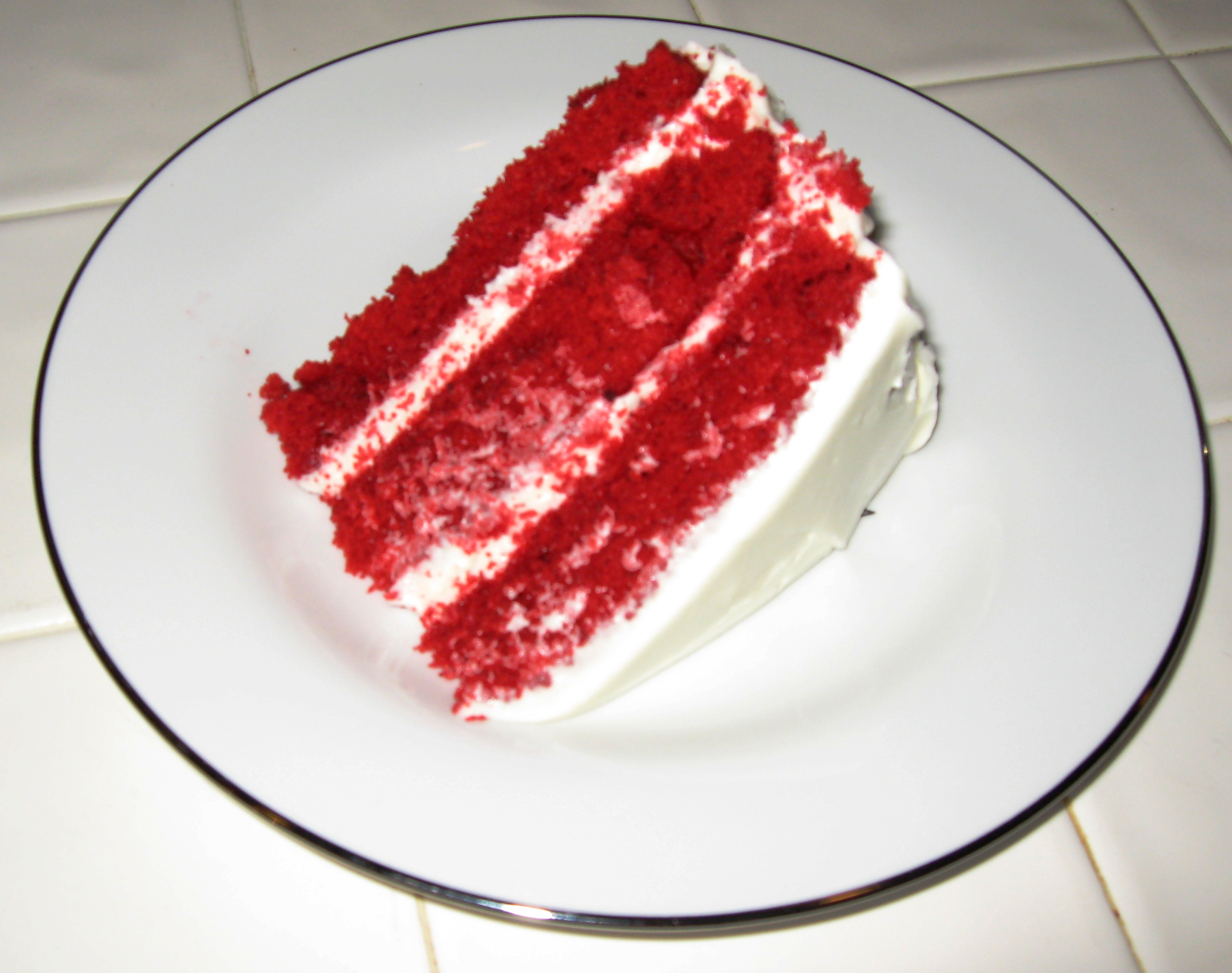 Preheat oven to 350. Beat eggs; add sugar. Mix cocoa and food coloring. Add to butter and egg mixture; mix well. Sift together flour and salt. Add to creamed mixture alternately with buttermilk. Blend in vanilla. In a small bowl, combine soda and vinegar and add to mixture. Pour into 3 greased and floured 9” round pans. Bake for 20-25 min, or till tester comes out clean…do not overcook or the cake will be dry.