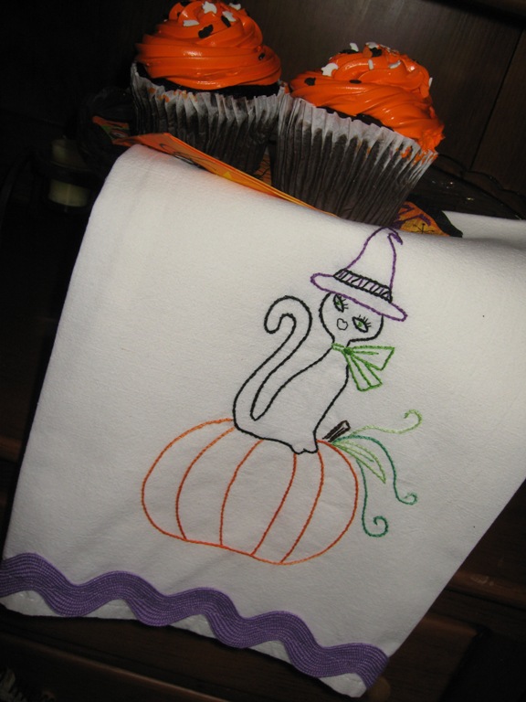I usually cross stitch something for Halloween but didn’t have time this year. I’ll show you some of those projects next week. Embroidery work is so much faster for me to get done. So, to get my Halloween fix on this year, I added retro kitty to a tea towel and used giant rick rack to embellish the bottom.
