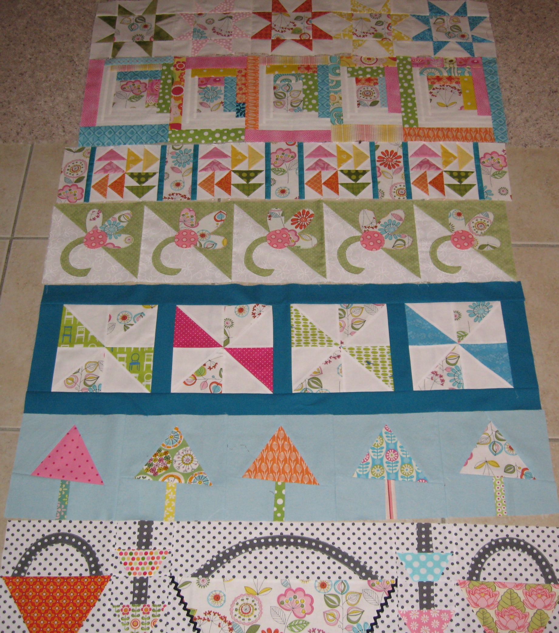 We finished the Pick A Bunch and the Fluttering Butterflies quilts. We made 2 table runners. All will be kitted for the show.