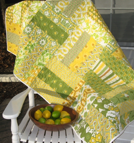 These quilts are easy to assemble using mostly 3-1/2 ” to 4-1/2″ strips pieced together to make a 12-1/2″ block. Alternating the directions of the blocks adds interest. These quilts can be made any size by adding as many blocks as you have fabric for or adding borders. They can be quilted or put some Minky on the back, turn it inside out and tie it off with embroidery floss for a quick gift. We even used the leftovers for the backing.