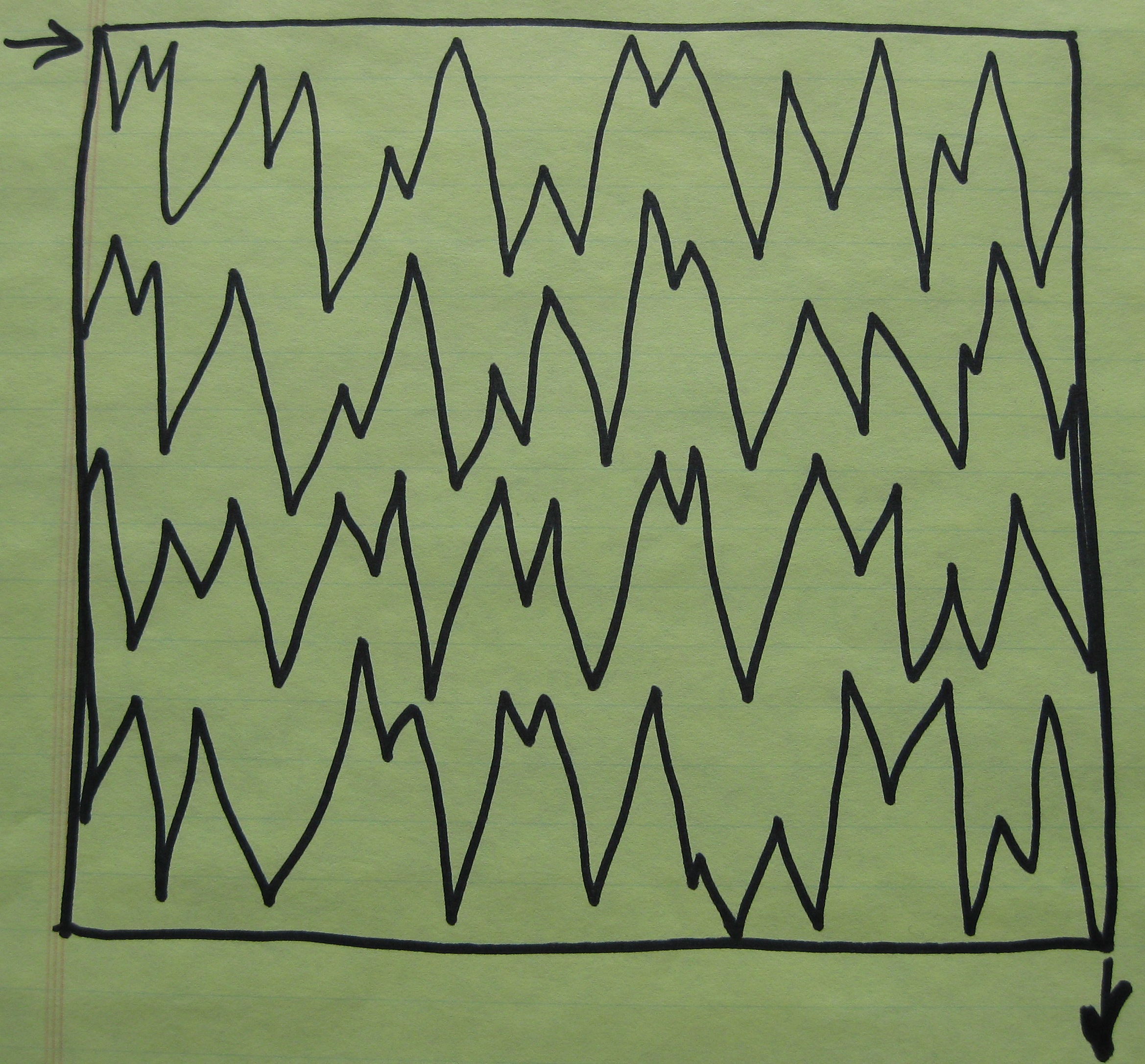 Square 3 – This pattern is very similar to the water design above it has the same back and forth motion but instead of a soft curve as you change directions you create a sharp point. I found this pattern easier to quilt by going up and down rather than side to side.