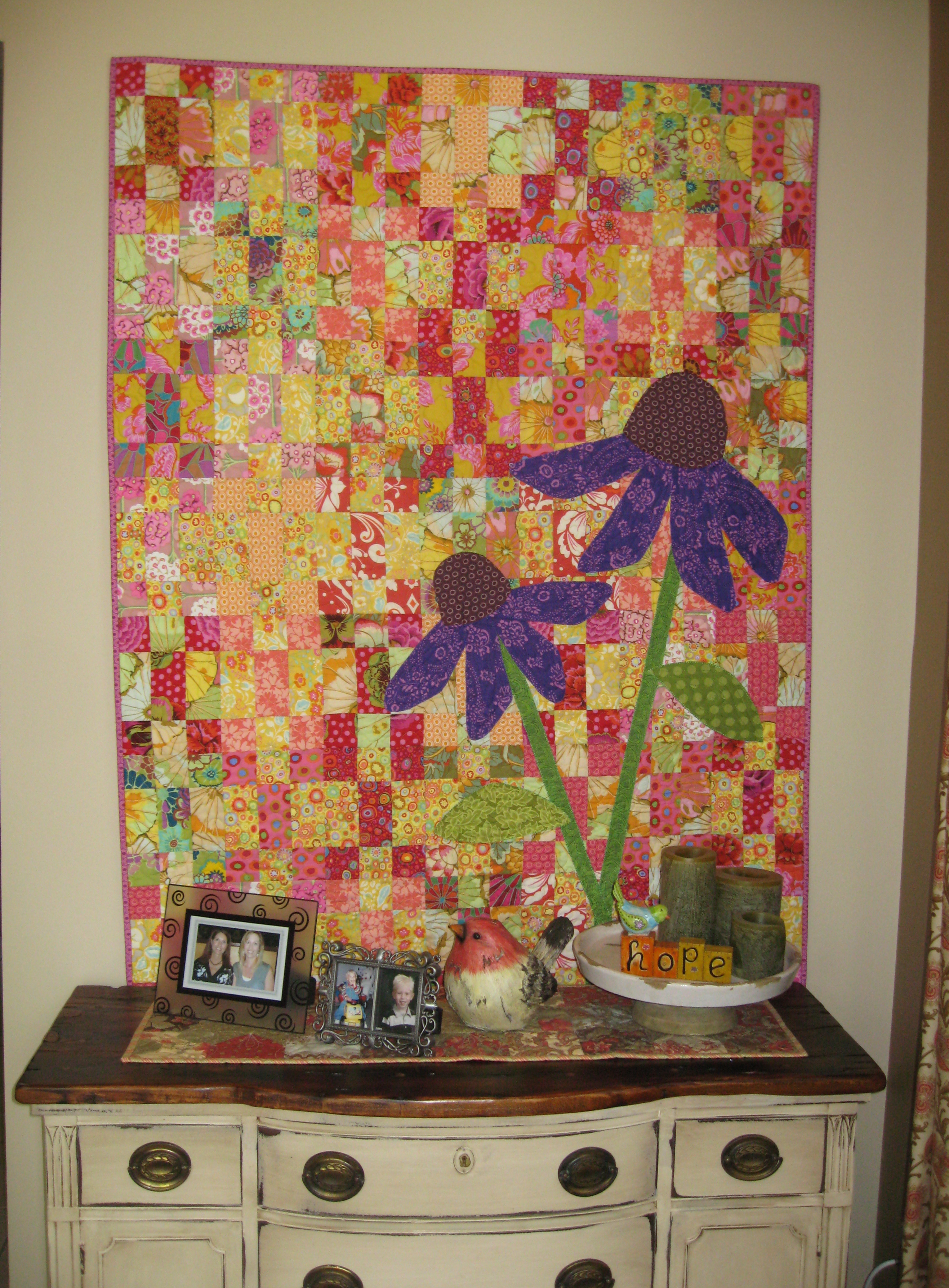 And last, I hung the finished Sassafras quilt in my living room. Paige also did an all over design on this since it was so busy but added some special touches to the cone flowers.