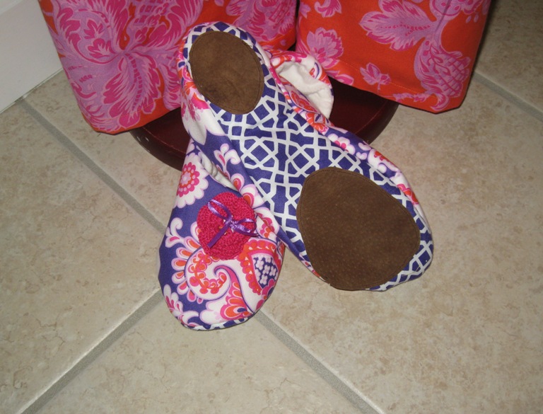 The slippers are made from the pattern Pigs In A Blanket. They have a Minky inner lining and leather patches for the sole. I attached a couple of the crocheted flowers my mom made with a tiny purple ribbon for extra cuteness. This was a pretty easy pattern. These would make really cute Christmas presents.