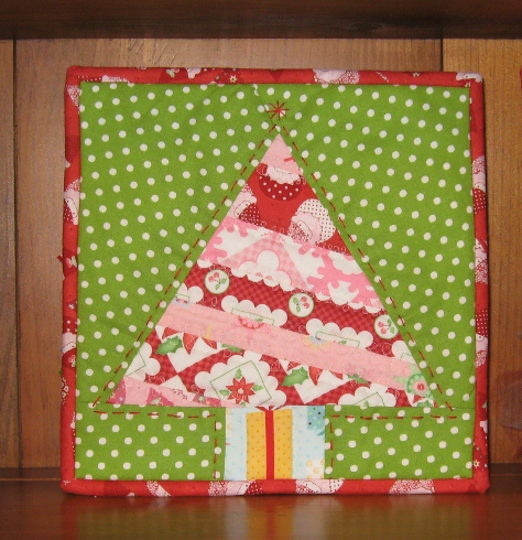 This is a great stash project – combine festive fabrics for the trees with contrasting backgrounds and tree trunks. Use easy paper pieced blocks and finish with binding, quilting and simple embroidery.