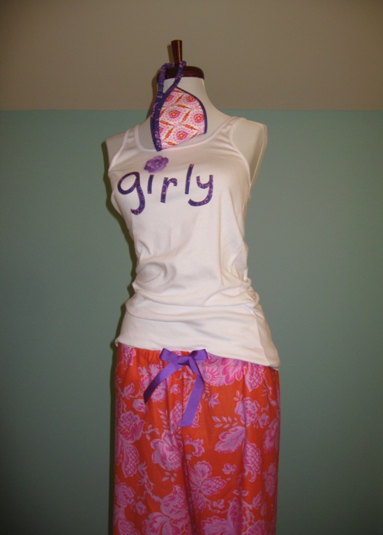 We purchased a few dress forms a couple of months ago and I’ve been jonesing to fancy her up a bit. I knew exactly what I wanted to do and use…a Honey Child ensemble of p.j.’s, slippers, eye mask, and a cute tee, and I wanted it to be very Girly!