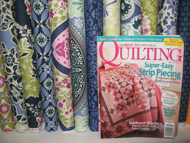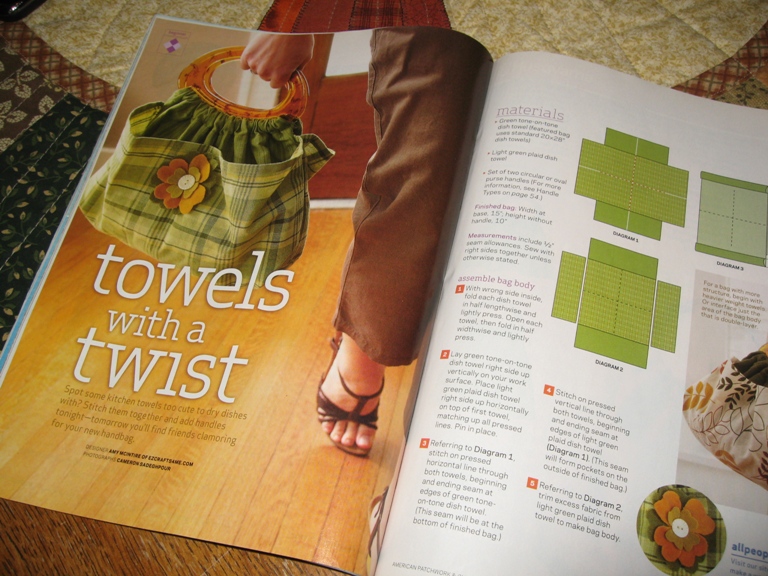 We’ve been working on a few projects recently. A commission quilt for one of Paige’s friends, which I hope to show off soon and a couple of other things in the works. Recently, I found this back issue of American Patchwork & Quilting that had a cute purse made from tea towels in it and we really wanted to try it out.