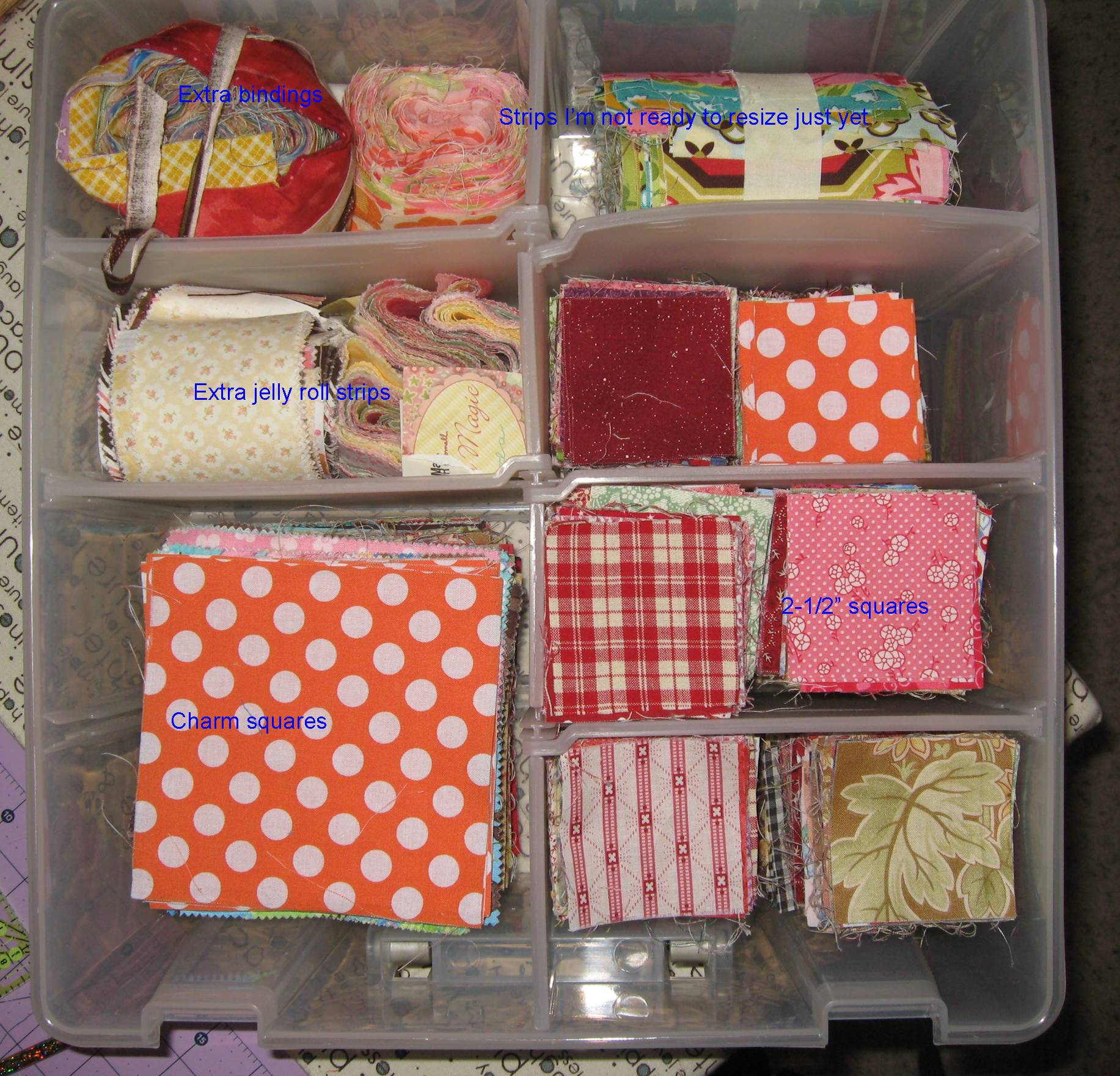 I bought a container at Joann’s but ideally I want to make a trip to the Container Store for a better one because I think I would prefer to not only have the squares organized by size but also color. If I need a red square for applique, I would know exactly where it is. But this will have to do for now.