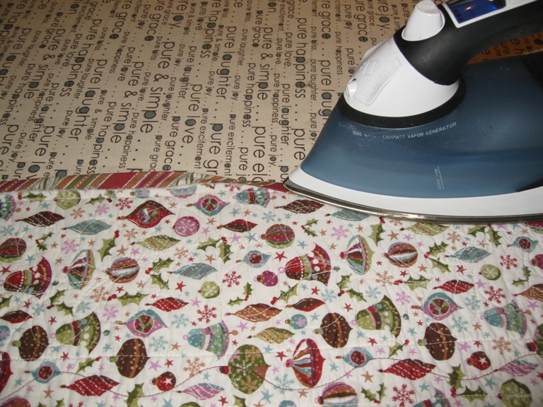 Attach your binding the way you normally do. **My bindings are cut at 2-1/8″ to 2-1/4″. This is an even distribution on binding on the front and back and allows you to just catch the back binding while using this machine binding technique.** After the binding is sewn down, iron your binding flat. This helps you pull it around to the other side. BTW, this is the best iron ever! I didn’t think anything could ever replace my Maytag cordless iron but this Reliable iron is sooo awesome!