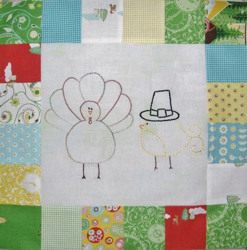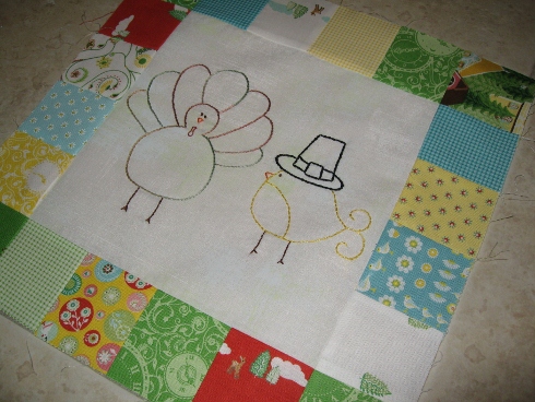November Birdie block is finished. Only a few minor additions to the block this month. Birdie has a new pilgrim hat and a fat turkey for his feast, although Mr. Turkey is too pretty to eat! I stitched him in my Cosmo Seasons variegated floss. And birdie eating Mr. Turkey might be considered cannibalism…hmmm.