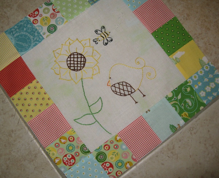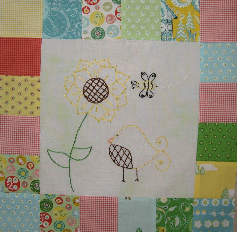 Birdie’s still hanging in there though. I love the sunflower idea and my mom suggested a bumble bee. That was a great addition to an already cute block. Thanks again Little Miss Shabby!