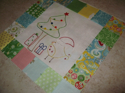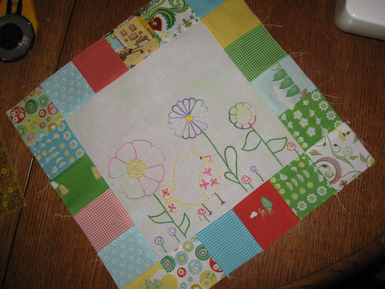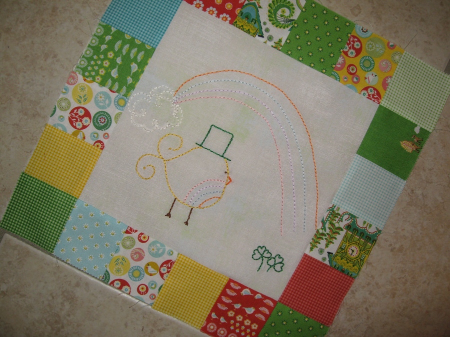 I modified the Birdie Stitches block 3 just a bit. I couldn’t help but add some shamrocks and a leprechaun hat to the bird.
