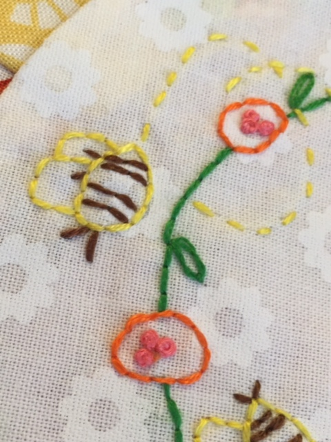Are you ready to Bee wowed by the cuteness factor of our March door prize? I used an orphaned dresden block, Ring a Ring a Roses Candlemat dresden, from one of my demos and whipped up this little bit-o-honey.