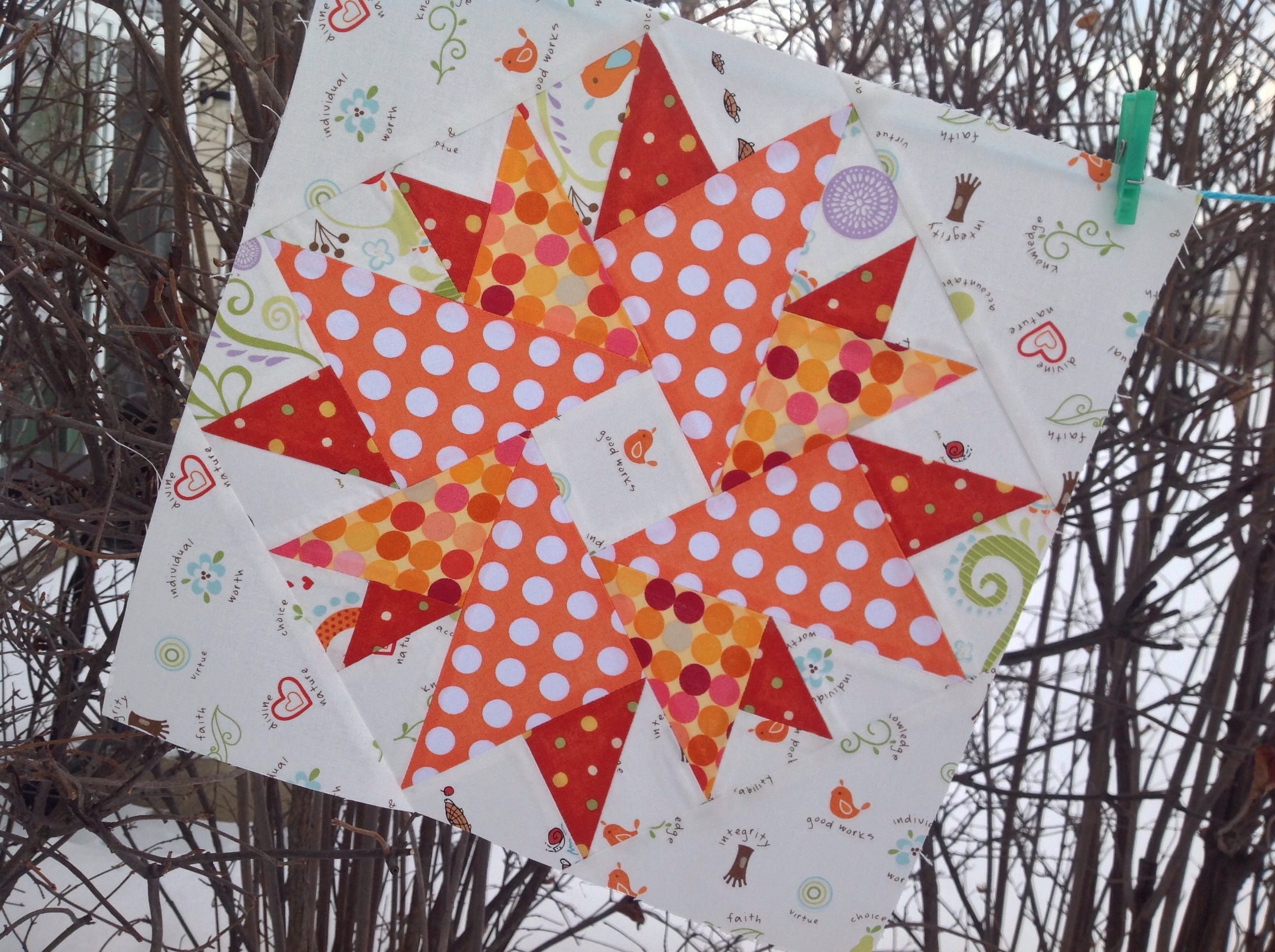 My second block was a really good tutorial from LaineyBugDesigns. This time I used a variety of orange dots for the star and mixed up all of my fun, low volume prints. I fussy cut the little “good works” birdie. Cute, huh? Orange dots. Scrappy low volume.