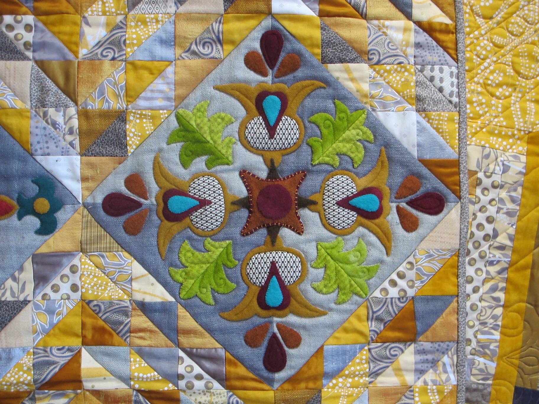 We have a guest speaker in March. Lynn from A Different Box Of Crayons is coming! Lynn continues to inspire us with her use of mixed media into her designs. She incorporates alternative fabrics into her work such as silk, wool, embroidery, and decors. Her newest BOM is Cathedral Doves. Is that a beauty, or what?