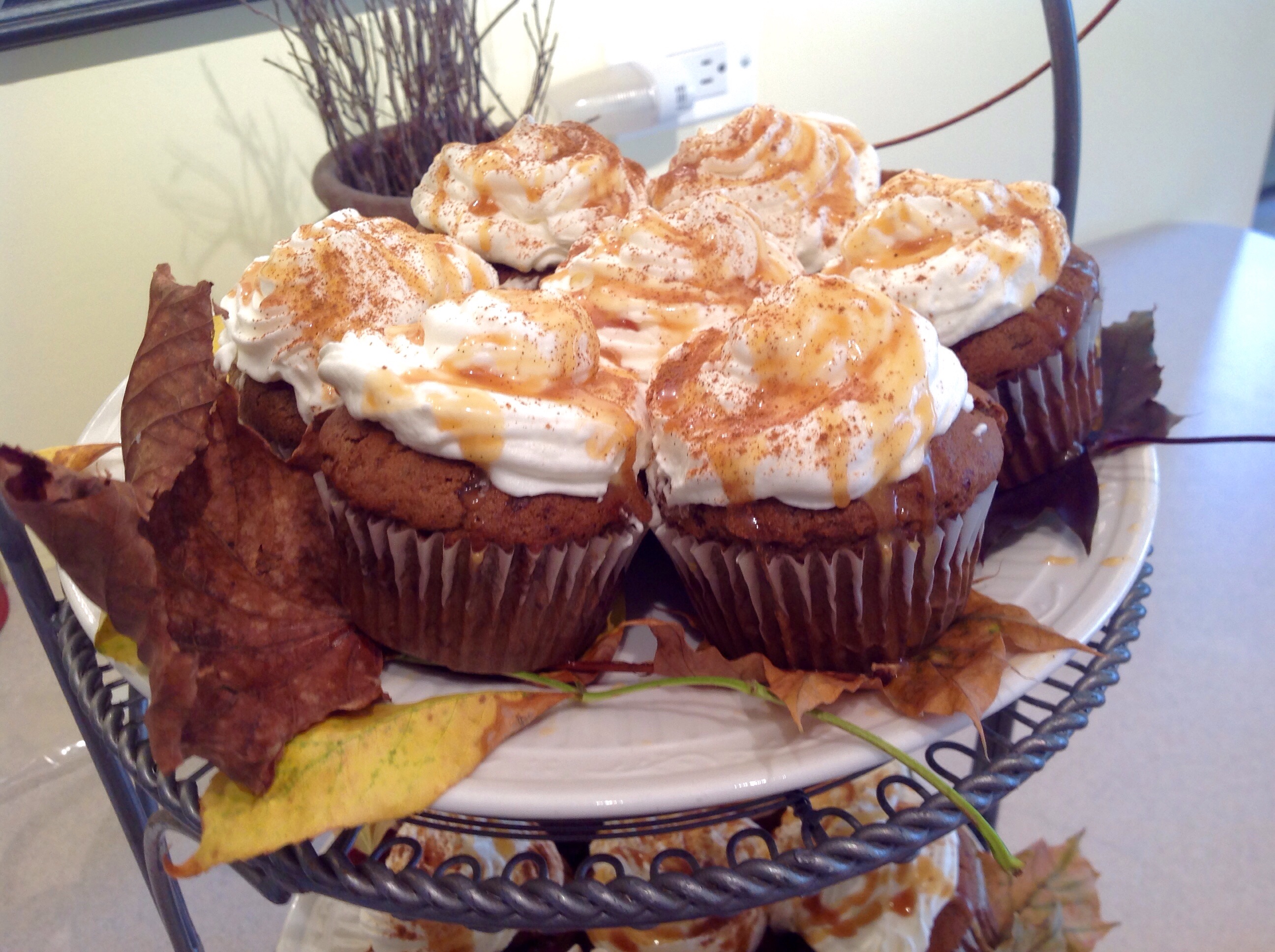 This week, Susan and I made cupcakes. Pumpkin Spice Latte cupcakes. These turned out as beautiful as they tasted with homemade whipped cream & caramel, displayed with a fall theme. You want one, don’t you? We’ve made a plan to bake at least once a month. My diet’s gone to hell in a hand basket cause it’s all downhill from here with the holidays coming up.