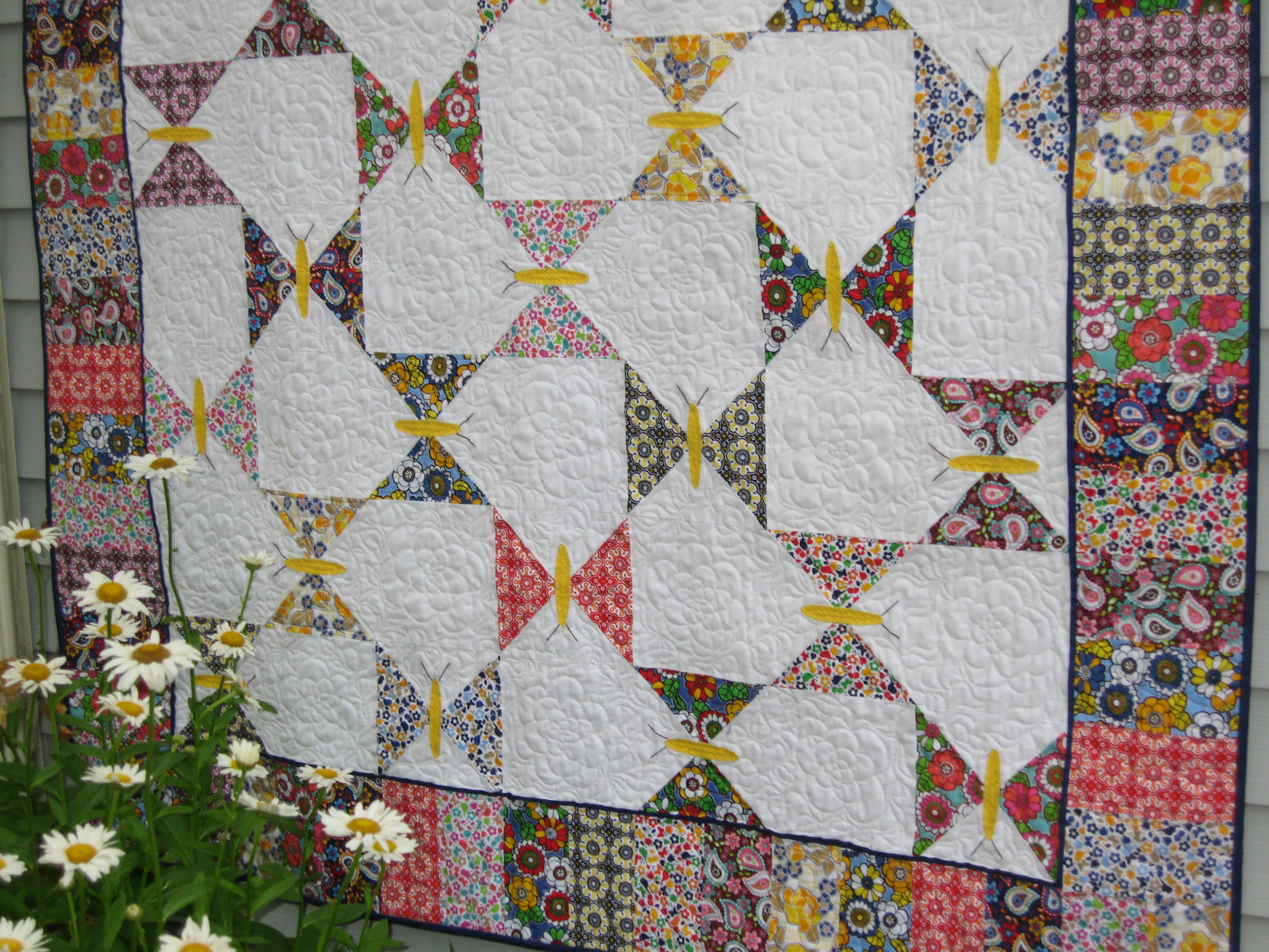 We also made a scrappy border from the leftover pieces of the FQ set and I hand embroidered the butterfly antenna instead of machine stitching it. If you haven’t figured it out yet, Paige and I have a hard time leaving well enough alone when it come to quilting, me with the visual and her with the designing. But I’ve always been like that. It’s part of the process of making something your own work of art.